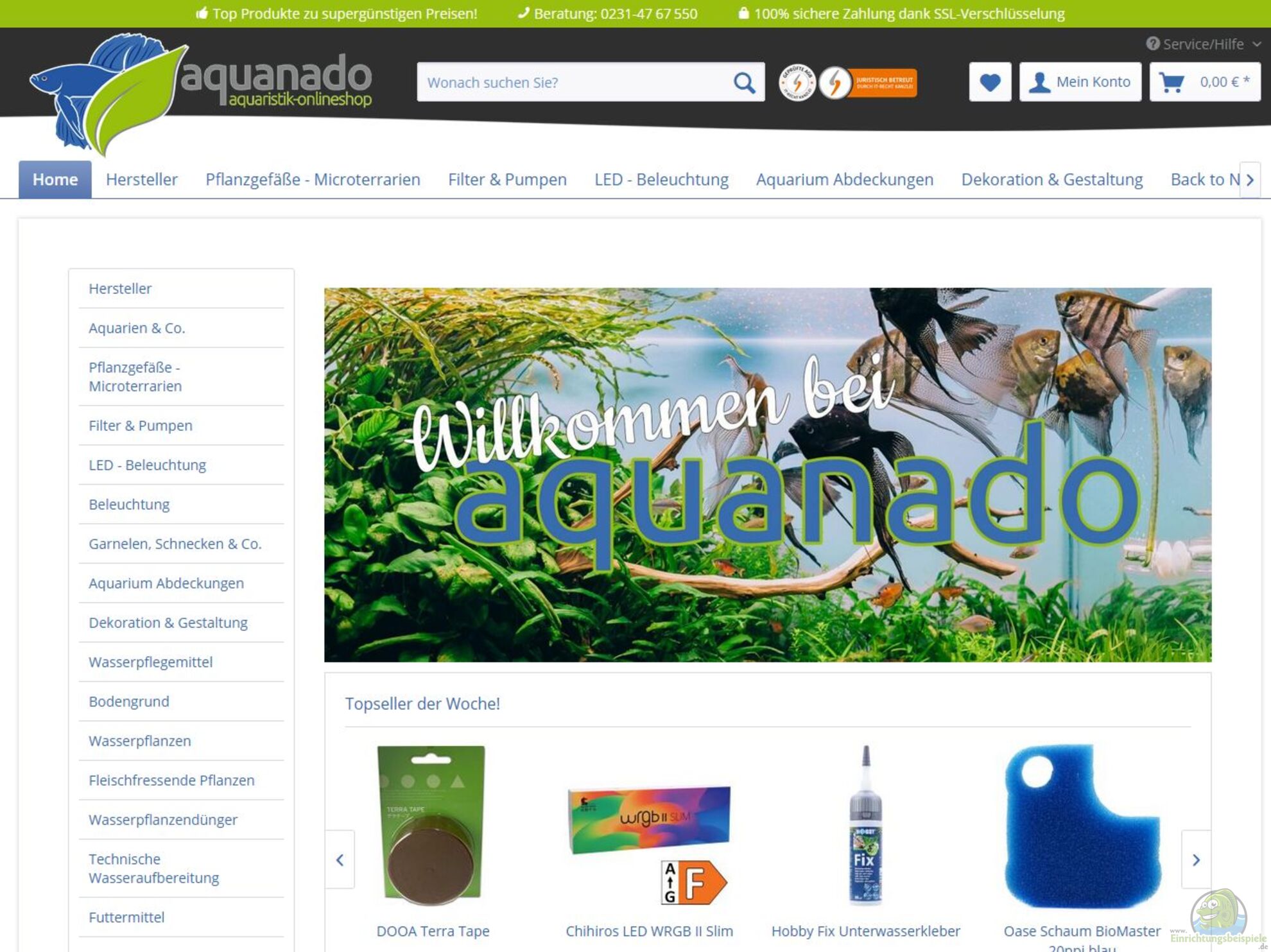 Das Sortiment umfasst Aquarien, Technik, Beleuchtung, CO2-Anlagen, Dekoration, Wasserpflegeprodukte und Zubehör für Gartenteiche.