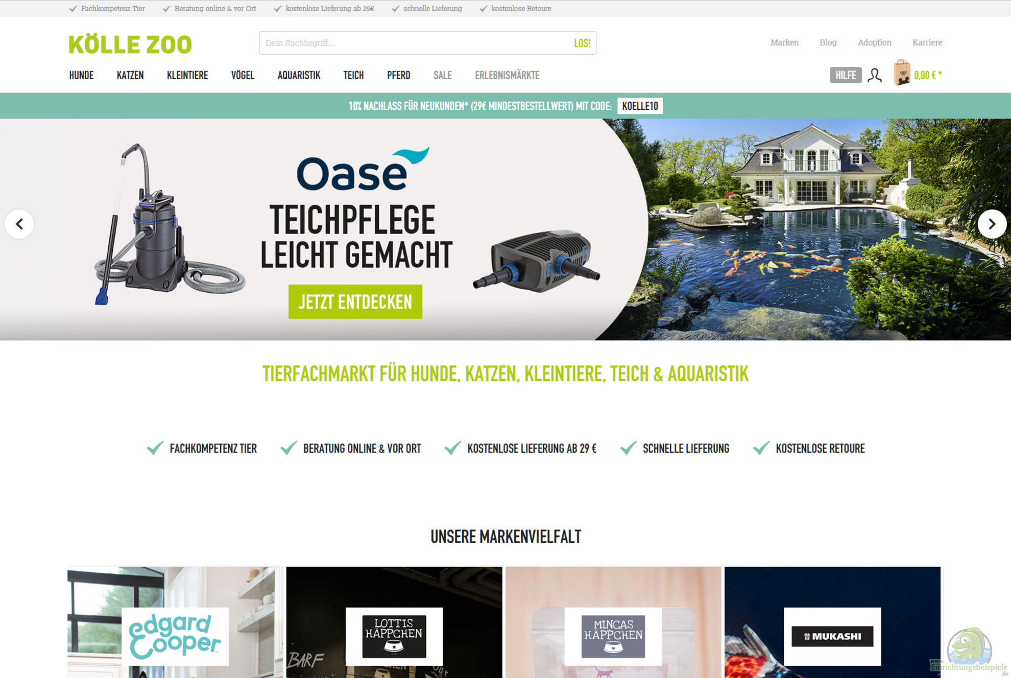 Der Onlineshop koelle-zoo.de bietet in seinem Onlineshop zahlreiche Zubehörartikel für den Haustierbereich an. Das Angebot umfasst die Bereiche Hunde, Katzen, Kleintiere, Vögel, Aquaristik, Teich und Pferd. Für die Terraristik werden online keine Artikel angeboten.