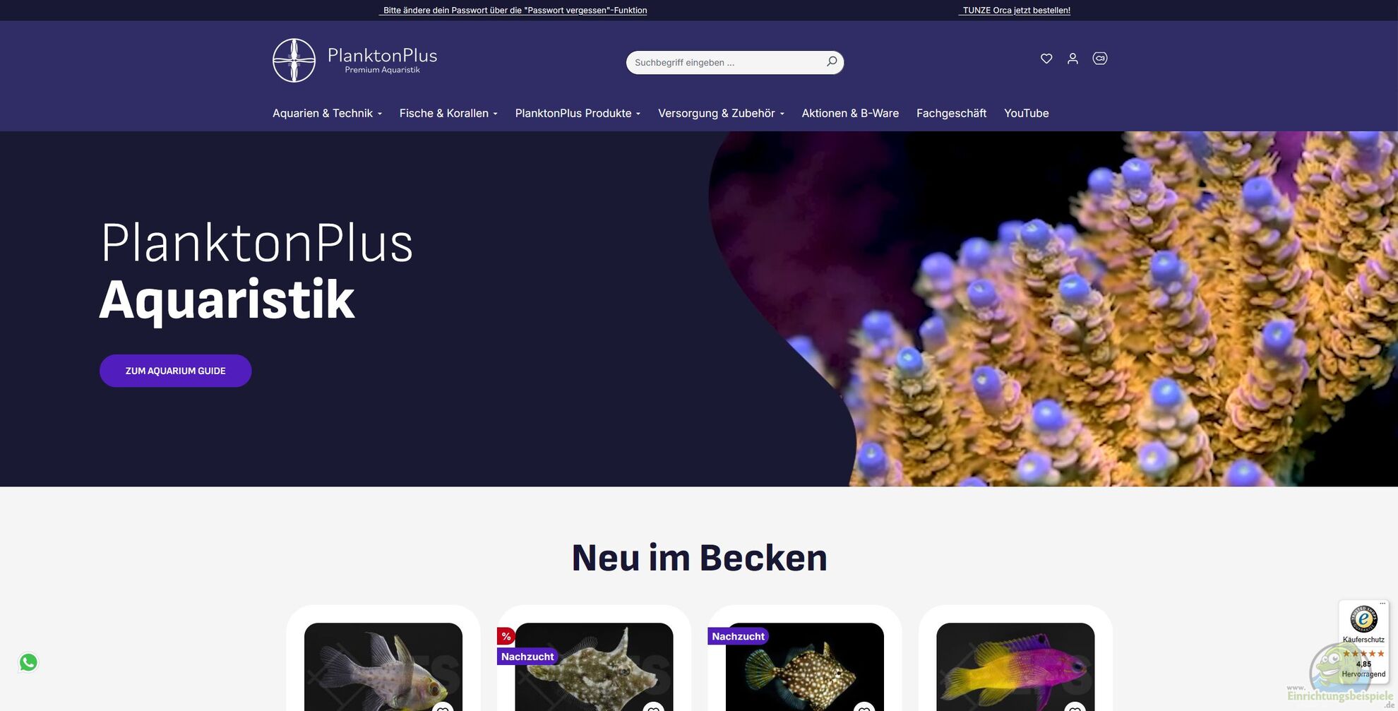 Der Onlineshop planktonplus.de bietet ein umfassendes, gut strukturiertes und fachlich fundiertes Angebot für Aquarianer aller Erfahrungsstufen. Mit einem breiten Sortiment aus Technik, Zubehör, Lebendtieren, eigener Produktlinie und persönlicher Beratung deckt der Shop nahezu alle Bedürfnisse des Aquaristik-Hobbys ab. Die Kombination aus Online-Shop und stationärem Fachhandel, der Fokus auf natürliche Produkte sowie die aktive Einbindung der Community machen diesen Anbieter besonders attraktiv. Egal, ob du auf der Suche nach neuen Korallen, hochwertigen Plankton-Produkten, Techniklösungen oder Beratung bist – bei planktonplus.de findest du eine vertrauenswürdige Anlaufstelle mit echter Expertise und umfangreichem Angebot.