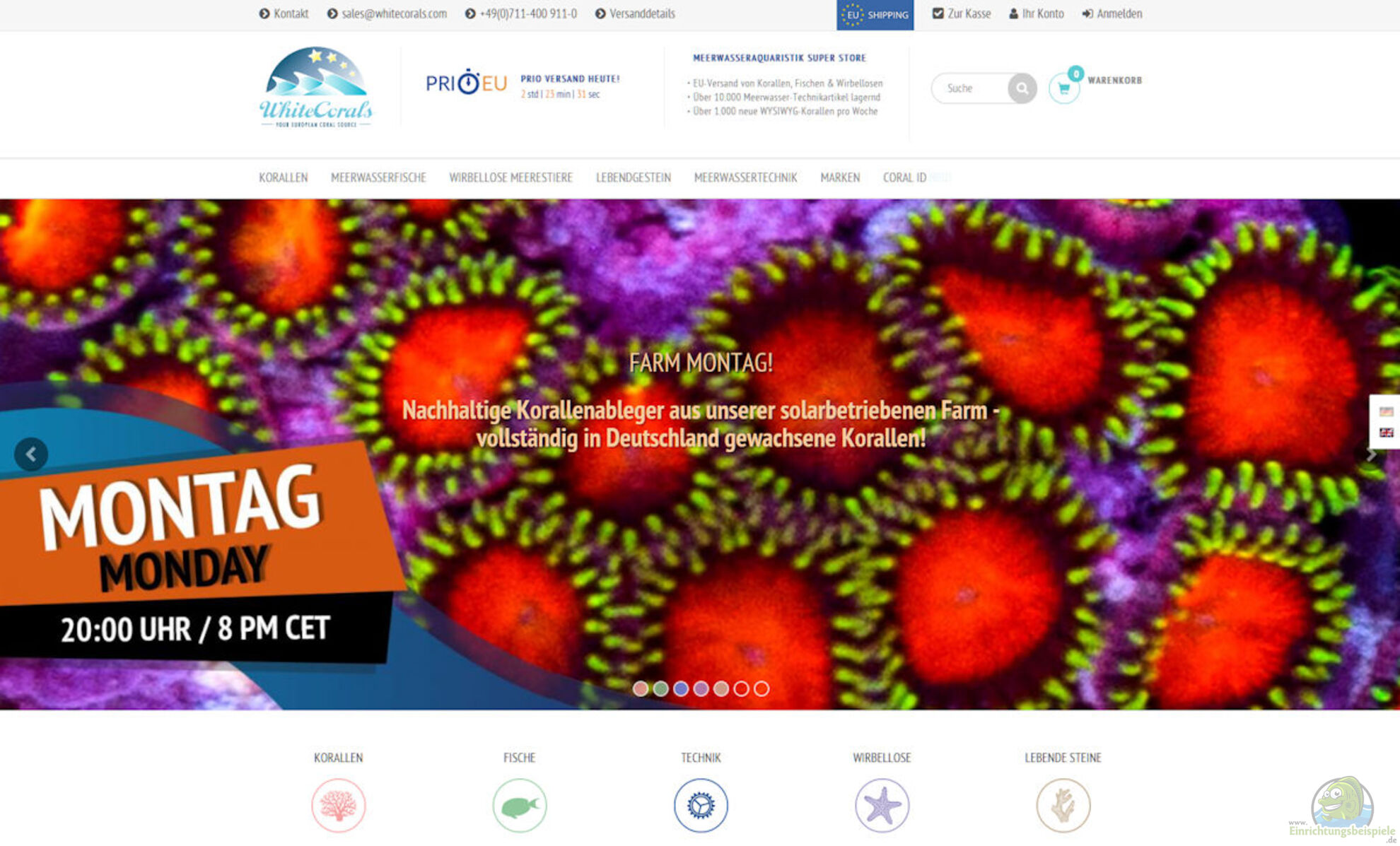 Der Onlineshop whitecorals.com bietet seit mehr als 25 Jahren (im Jahr 2022!) ein breites Sortiment für Meerwasseraquarianer an. Der Meerwasser Shop Whitecorals versorgt Kunden aus ganz Europa mit allem, was für ein Meerwasseraquarium nötig ist. Mehr als 10.000 Meerwasser-Technikartikeln und über 1.000 Korallen hat der Shop auf Lager.