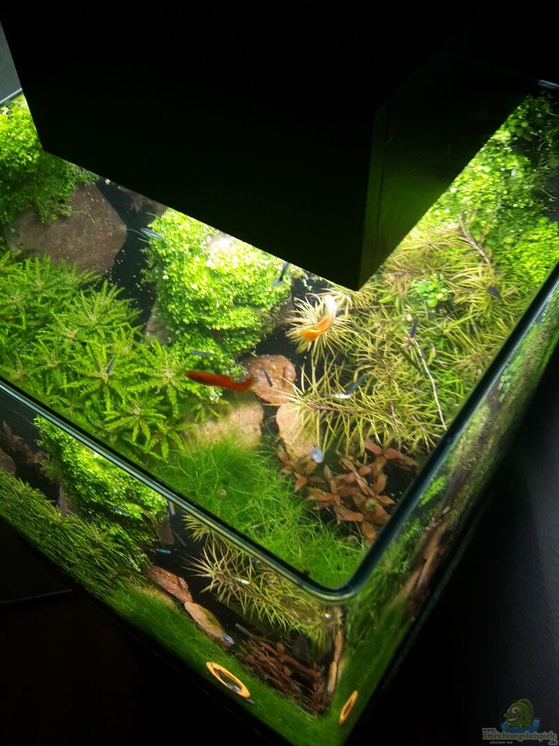 Das Besondere am Fluval Edge ist seine verklebte Abdeckplatte, die lediglich eine reltiv kleine Öffnung hat, über die im Aquarium hantiert werden kann oder Garnelen und Krebse gefüttert werden können. Vorteil dieser Bauweise ist die Möglichkeit, das Becken komplett mit Wasser zu befüllen, so dass keine Wasseroberfläche von vorne zu sehen und auch ein Einblick von oben ins Fluval Edge möglich ist.