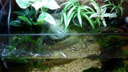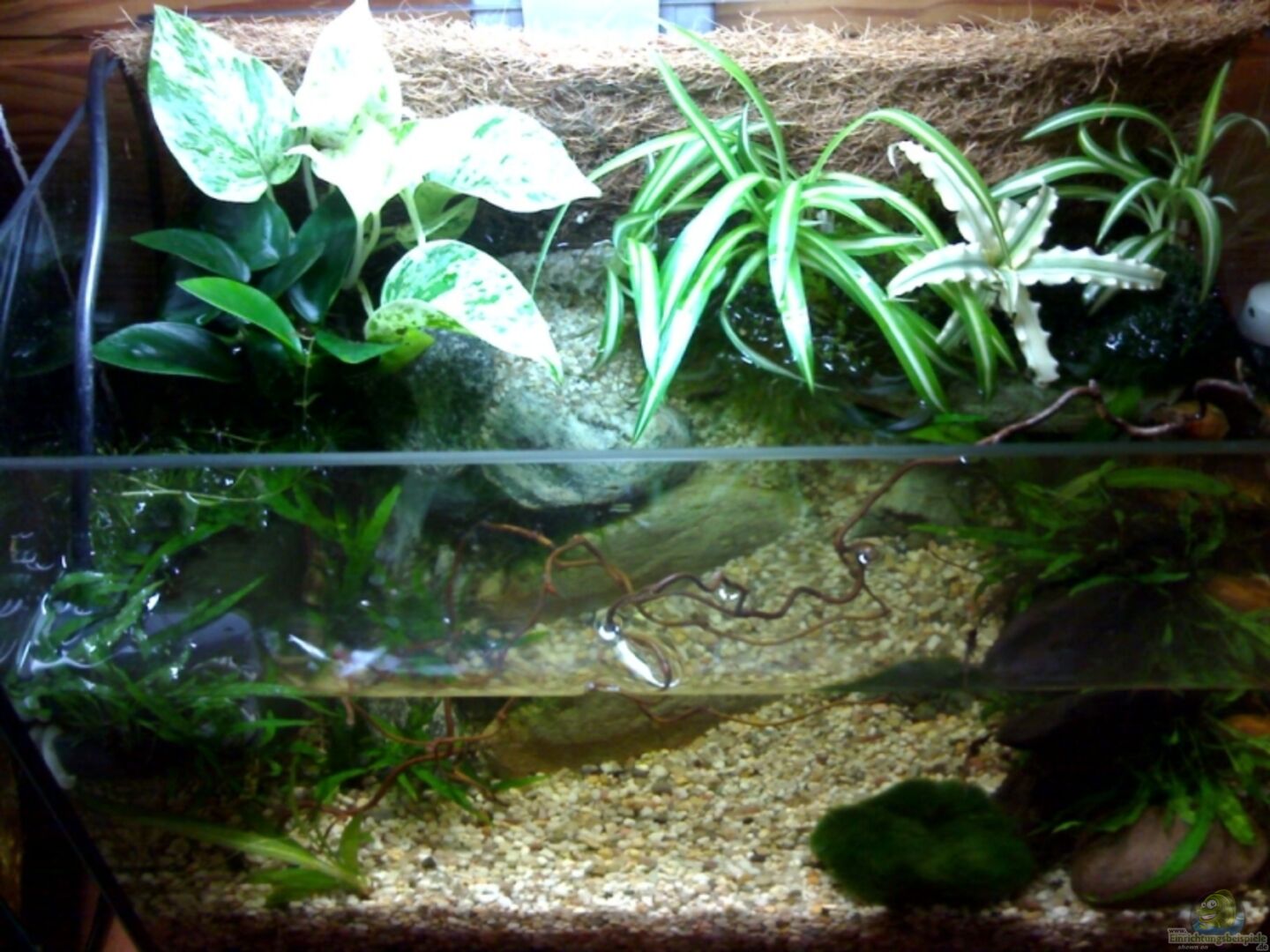 Beim einrichten des Aquariums als Teil des Paludariums gelten natürlich die gleichen Regeln wie für ein normales Aquarium ohne Terrariumteil. Es ist allerdings eine gute Idee bei der Gestaltung des Wasserteils darauf zu achten, dass sämtliche Reinigungs- und Wartungsarbeiten auch oder trotz des Landteils erledigt werden können müssen.