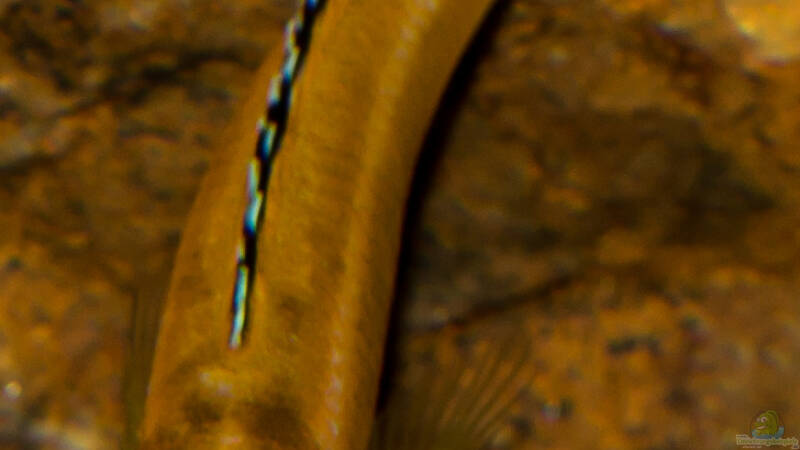 Auf der 3. Abbildung kann man schon sehr gut erkennen, das die Rückenflosse vom Kopf zum Schwanz deutlich an Farbe gewinnt und die Zeichnung schon jetzt die typische "Streifenoptik" bekommt. Die Afterflosse mit den Eiflecken wird immer kräftiger und die Brustflossen bekommen ebenfalls eine hellblau/ schwarz Färbung.