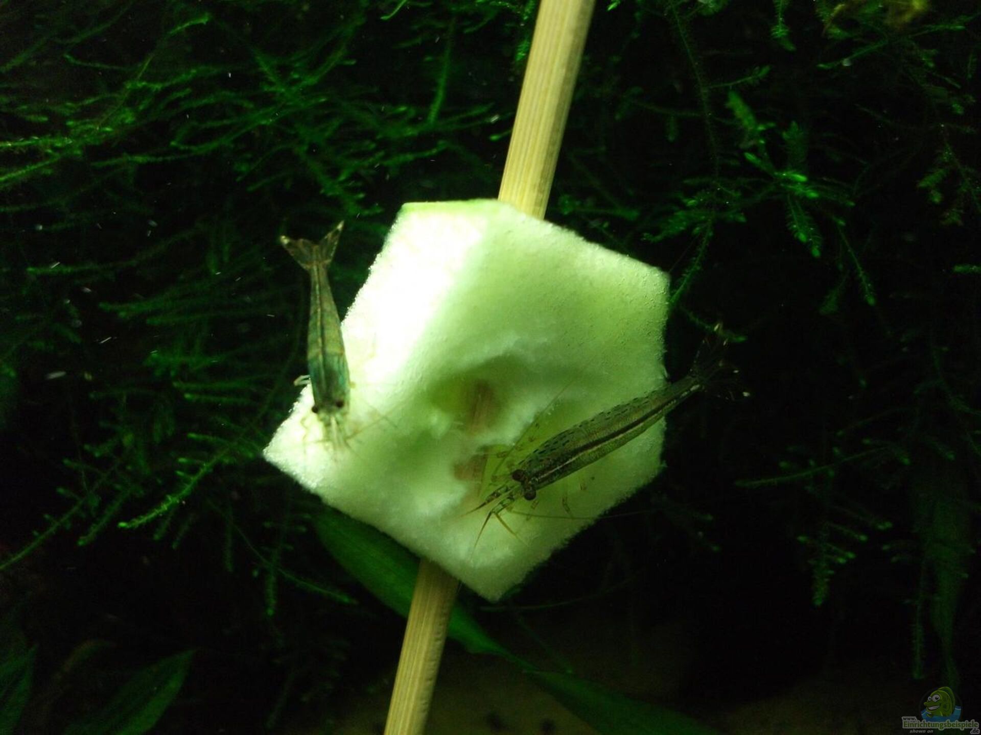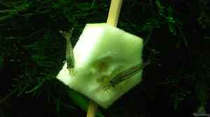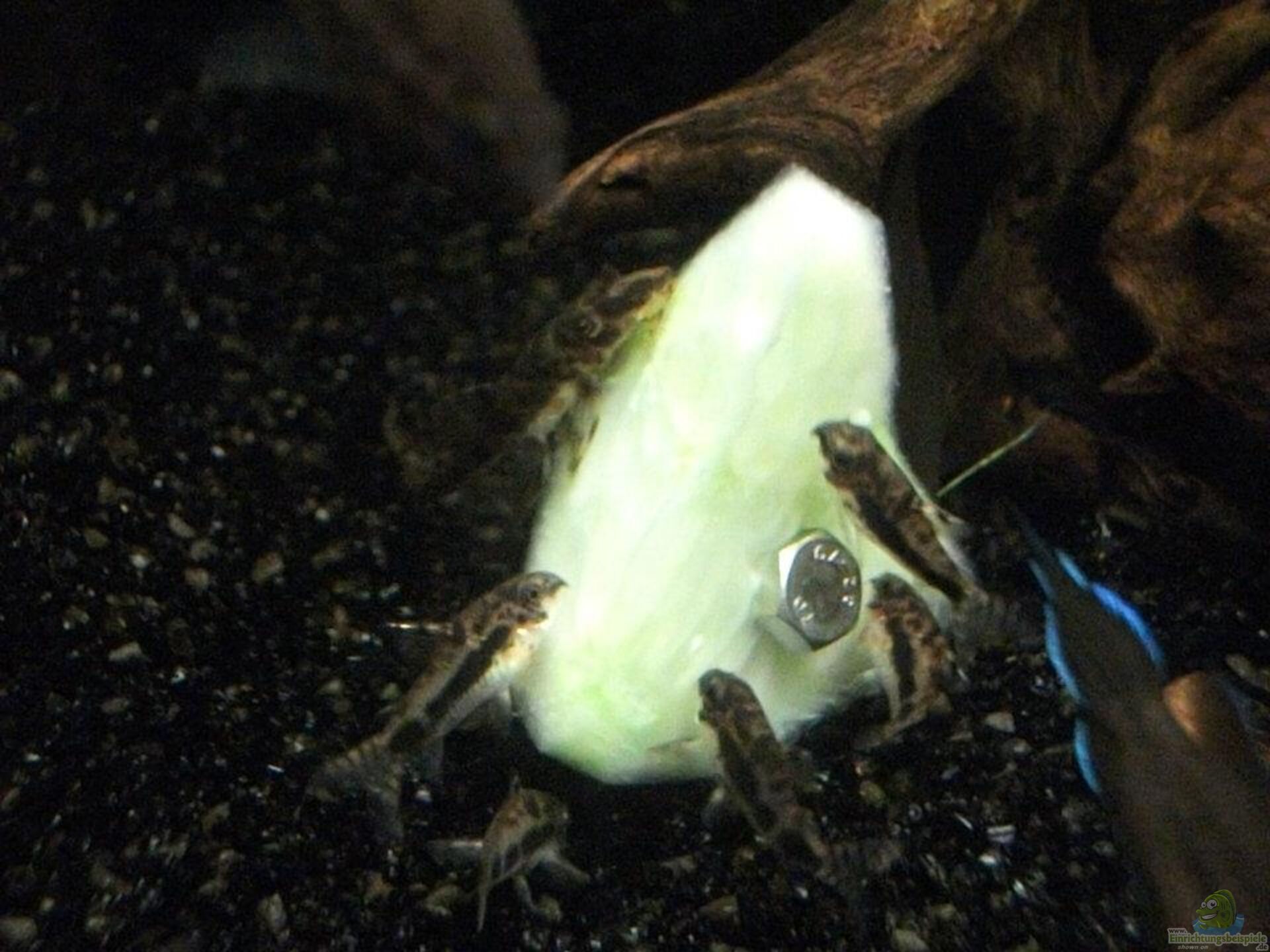 Anfangs habe ich meinen Otocinclus auf Schaschlikspie??e gesteckte Gurken serviert.