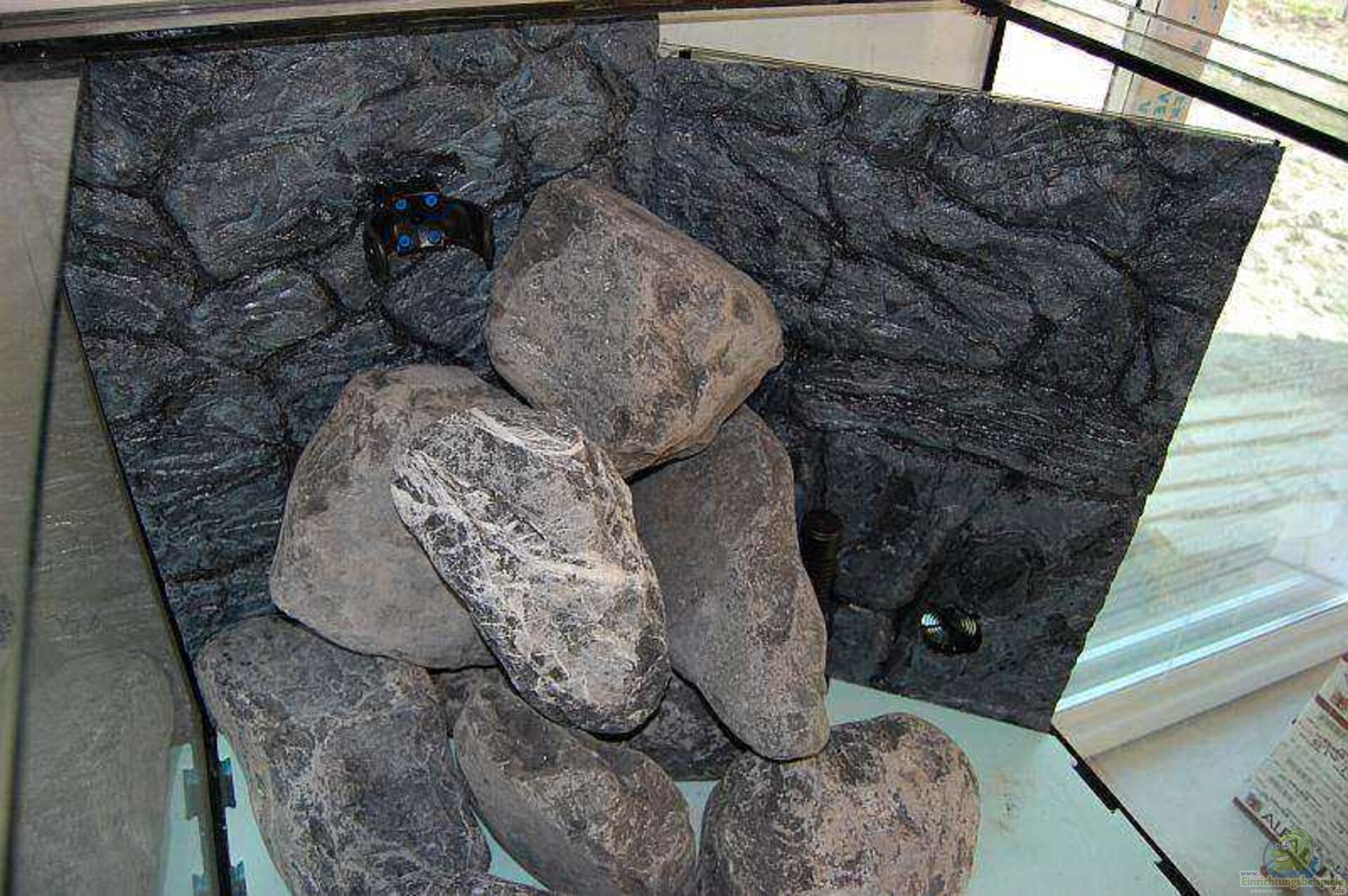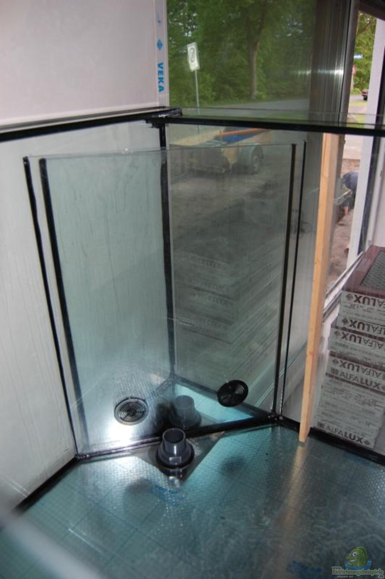 Im Mittelpunkt steht die doppelte Trennscheibe zwischen Aquarium und Schacht. Die linke Scheibe, zum Aquarium, ist mit dem bekannten Kamm zur Oberflächenabsaugung versehen und verfügt darüber hinaus in meinem Fall über zwei 50mm Bohrungen knapp über dem Bodengrund. Diese Bohrungen sind mit einem Kunststoffgitter passgenau abgedeckt.