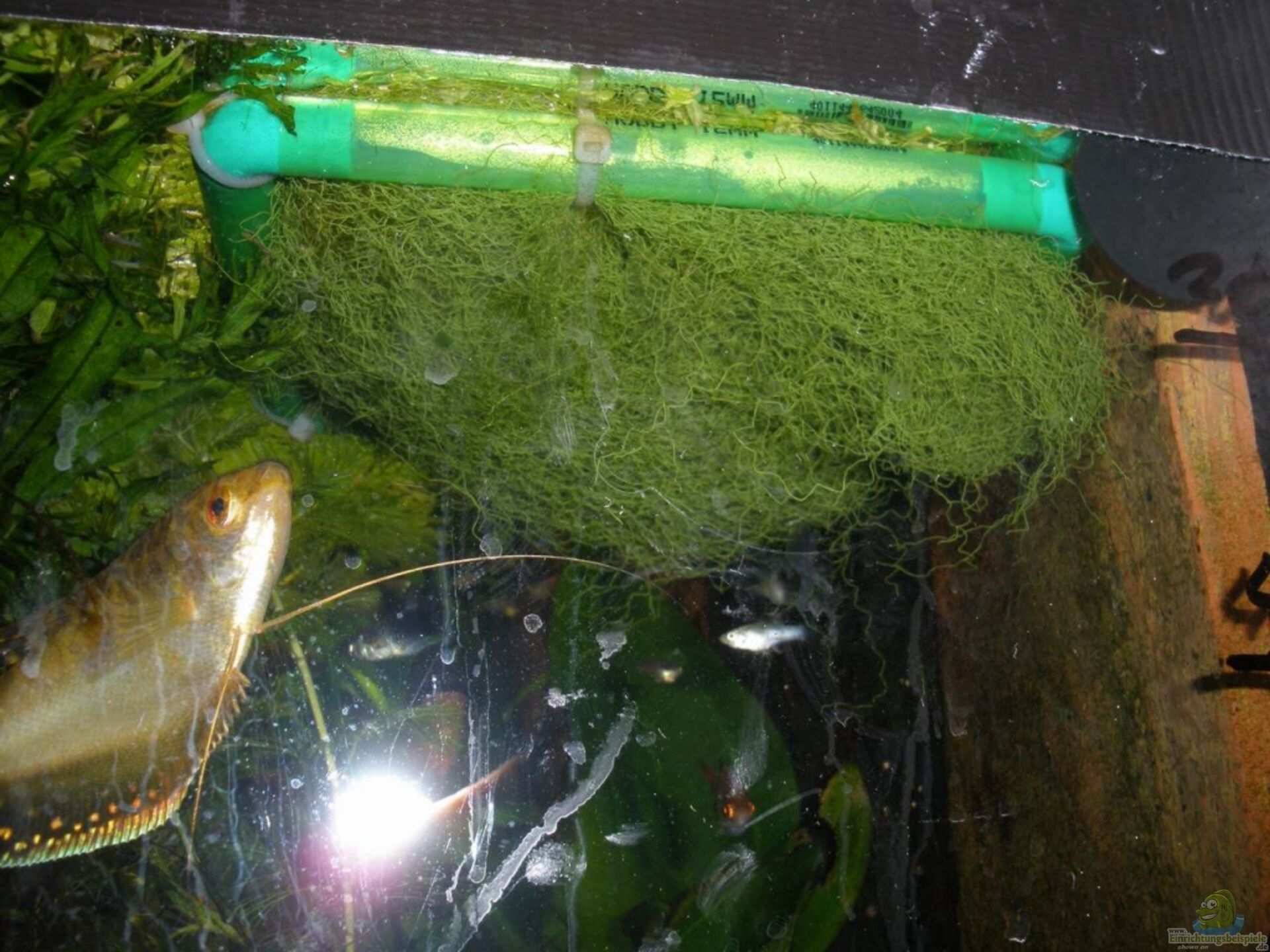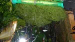 Also habe ich mir überlegt was kann ich machen um meinen Fadenfischen ein Ablaichplatz zu schaffen? Die Idee kam mir beim Händler als ich so durch die Gänge schlich und ich die grüne Filterwatte fein von der Firma Zoobest entdeckte. Das ist eine feinmaschige synthetische Faser und sieht fast so aus wie Javamoos. Desweiteren kaufte ich mir einen Futterring zum zusammenstecken. Das sind die einfachen Röhrchen mit Eckwinkeln. Habe einfach eine Handvoll Filterwatte genommen und jeweils an jeder Seite des Futterringes die Watte mit 4 kleinen Kabelbindern fixiert. Jetzt einfach noch ein Stück Angelschnur am Futterring befestigen und das ganze auf der Oberfläche mit einem Saugnapf an der Scheibe platzieren fertig ist der Laichplatz.