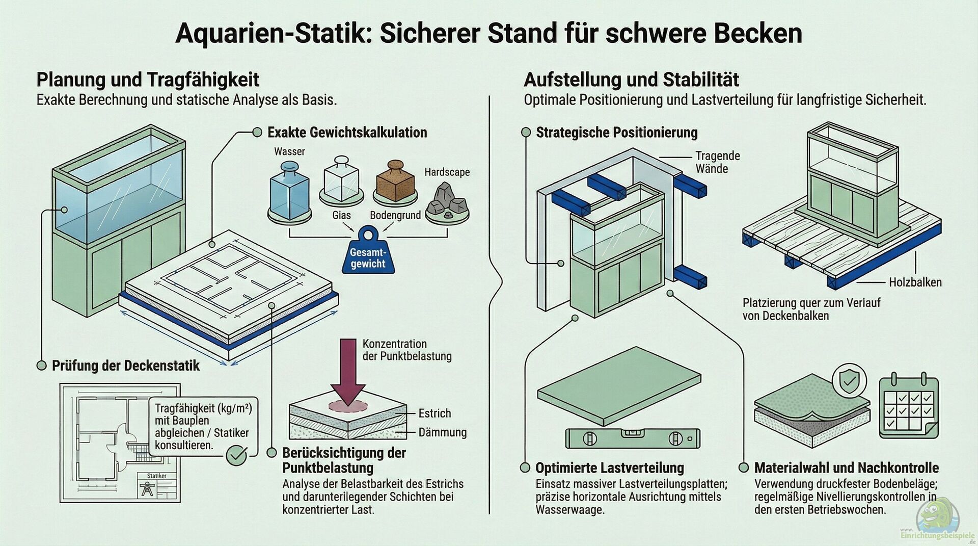 Man muss sich vor Augen führen, dass ein Aquarium kein gewöhnliches Möbelstück ist. Ein Schrank mit Büchern wiegt viel, doch das Gewicht ist meist statisch und über die gesamte Breite verteilt. Ein Aquarium hingegen übt einen permanenten Druck aus, der durch die Dichte des Wassers und die Schwere der Steine im Inneren konzentriert wird. Hierbei spricht man von der sogenannten Flächenlast. In vielen Altbauten mit Holzbalkendecken ist Vorsicht geboten. Man sollte das Becken idealerweise quer zu den tragenden Balken und unmittelbar an einer tragenden Wand platzieren.