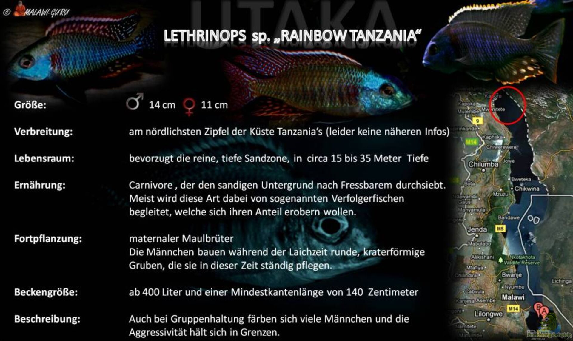 Da die Artzugehörigkeit der unter dem Punkt ???Besonderheiten??? beschriebenen Arten bislang nicht nachgewiesen wurde, kann aktuell noch keine abschliessende Aussage über die effektiven Fundorte, respektive Populationen gemacht werden. Fest steht aber, dass die als Lethrinops sp. ???rainbow tanzania??? bezeichneten Tiere lediglich in den nördlichsten Regionen der Küste Tanzania???s zu finden sind.