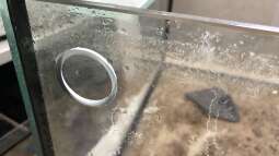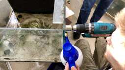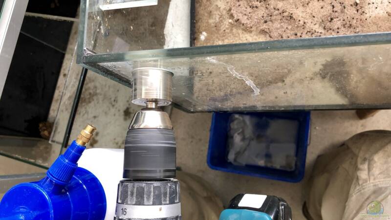 Da ich beruflich und auch ehrenamtlich ziemlich eingespannt bin, habe ich für die zukünftige Anzahl an Becken im Keller nicht die Zeit, überall einzeln mit dem Schlauch das Wasser zu wechseln. Somit kam ich zu dem Entschluss, dass auch meine Becken einen eigenen Zu- und Abfluss des Wassers benötigen werden. Jedes Aquarium soll zukünftig mit dem Gardena Microdrop-System mit dem frischen Leitungswasser versorgt werden. Und jedes Becken hat auch einen eigenen Abfluss für das Wasser. Dies sieht so aus, dass bei jedem Becken eine 3, 5cm gro??e Bohrung mit einem Dosenbohrer (diamant-besetzt, extra für Glas) ca. 3cm unterhalb des Beckenrands gemacht wurde. In diese kreisförmige ??ffnung kommt ein PVC-Rohr-System, das mit Gummi-Dichtungsringen versehen ist. (Siehe Bilder)