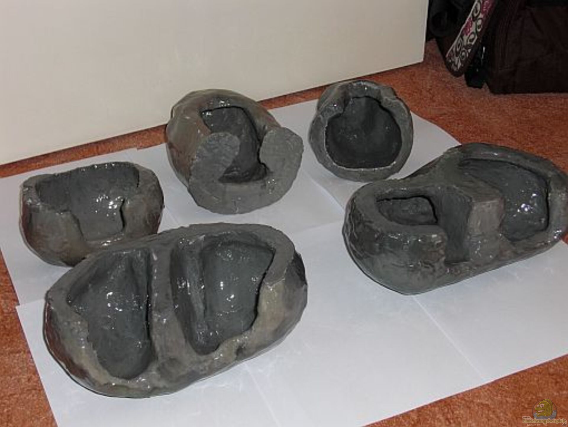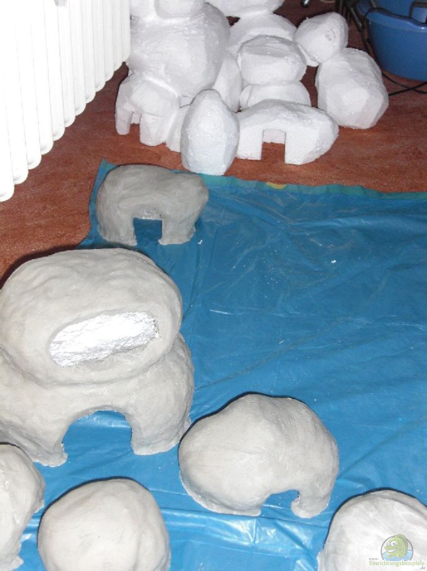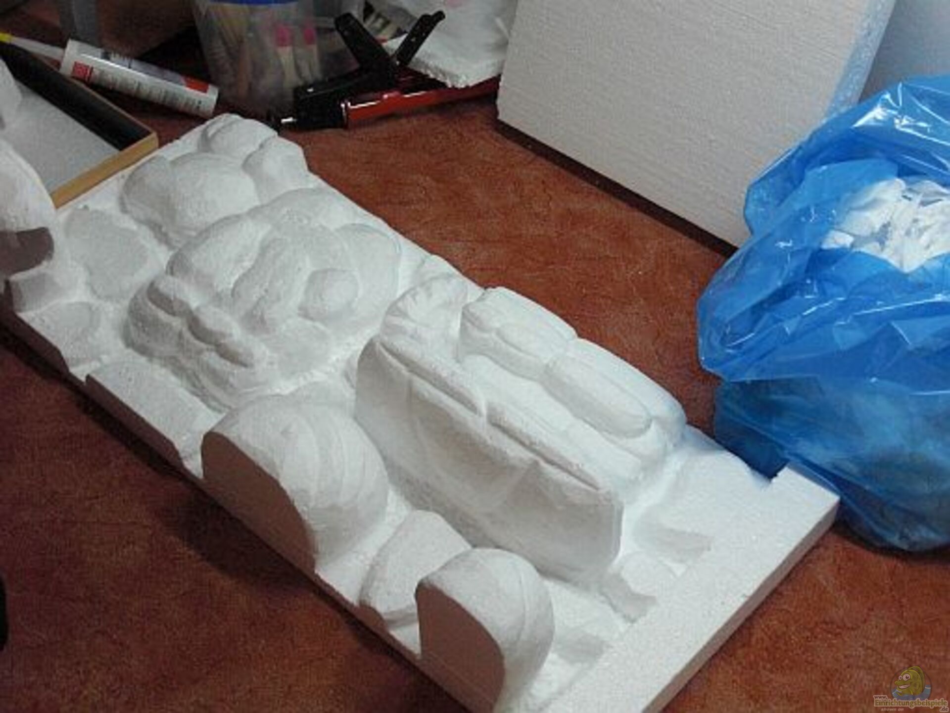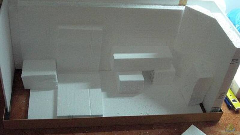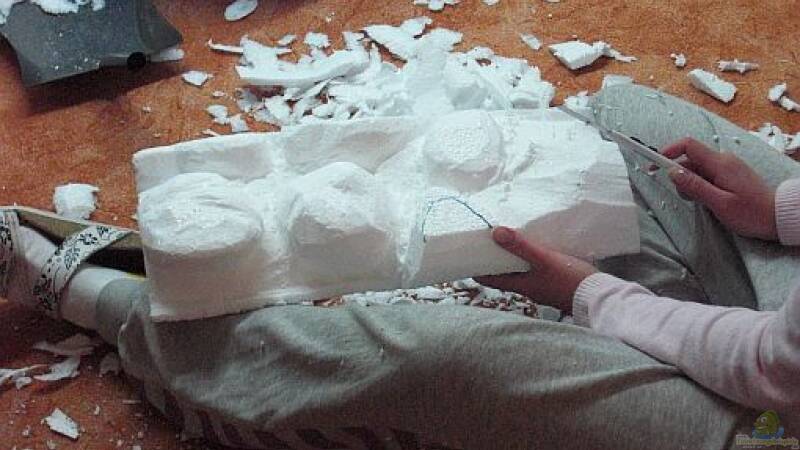 ??? grobe Klötzer (10 ??? 100 mm), die die Grundform des Gebirges bilden, schneiden und mit Aquariensilikon aufkleben