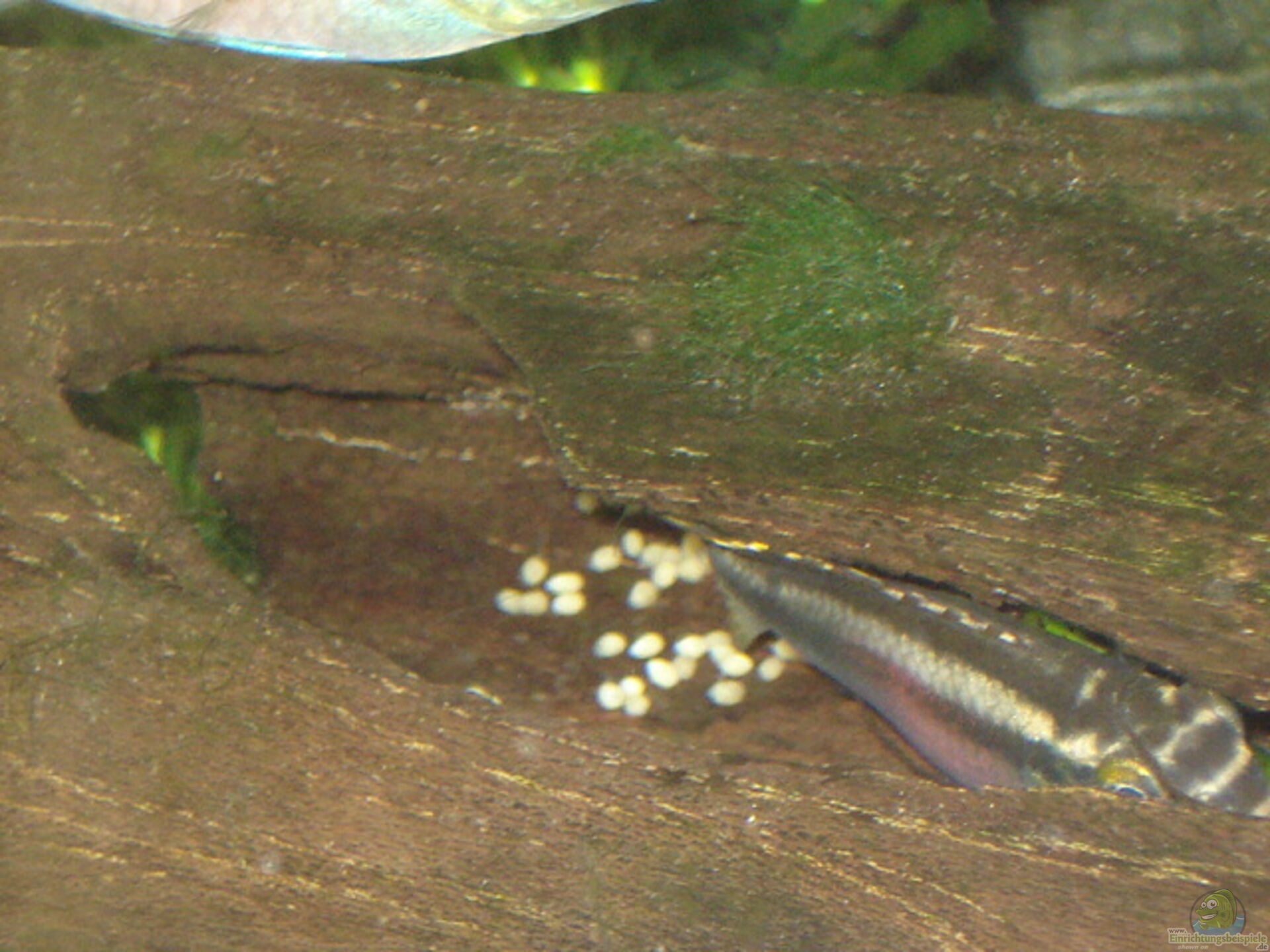 Auch dieser afrikanische Buntbarsch ist ein Höhlenbrüter. Das Weibchen lockt das Männchen in eine Höhle, wo die Paarung stattfindet. Anschließend bewacht sie die Eier und später die geschlüpften Larven.
