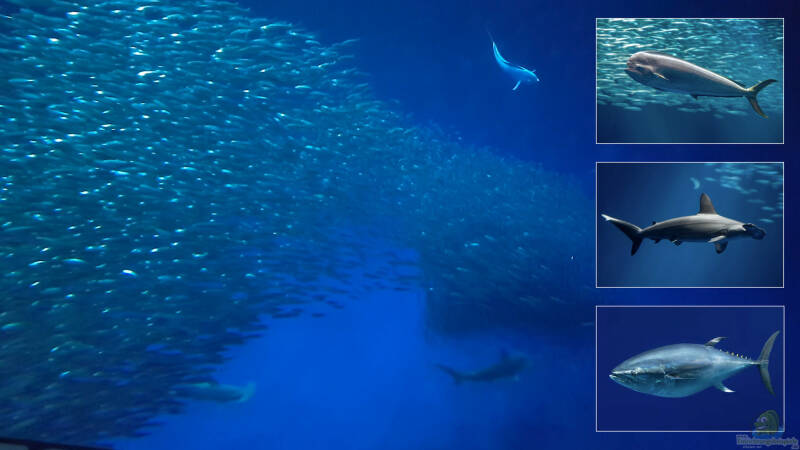 Das Riesenaquarium ist besetzt mit mit Delfinfischen, Thunfischen, Hammerhaien, Meeresschildkröten und einem riesigen Sardinenschwarm, sicherlich mehr als 1 MIllion Tiere. Gefüttert werden nicht die Räuber - die versorgen sich selber ;-), sondern die Sardinen. Und die Bay bietet jederzeit Nachschub.