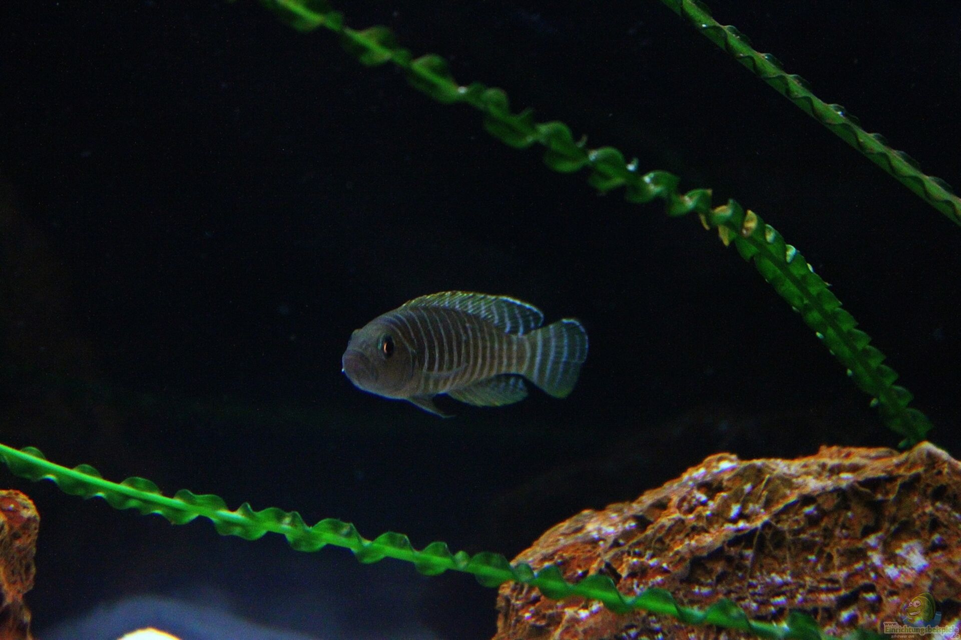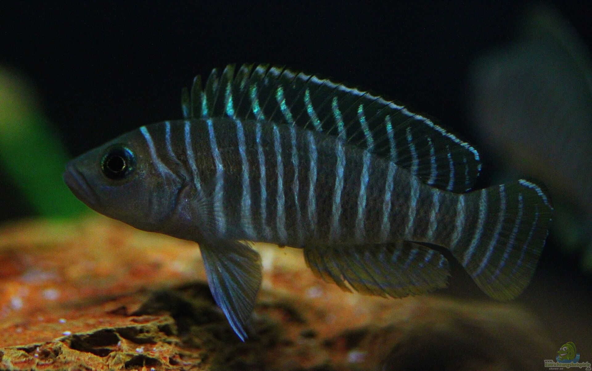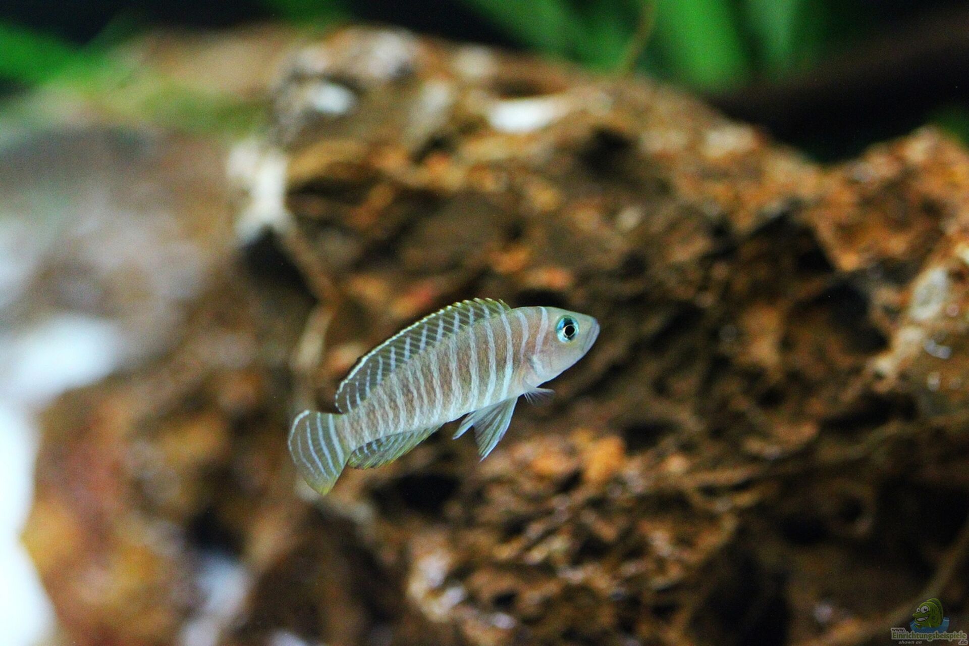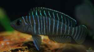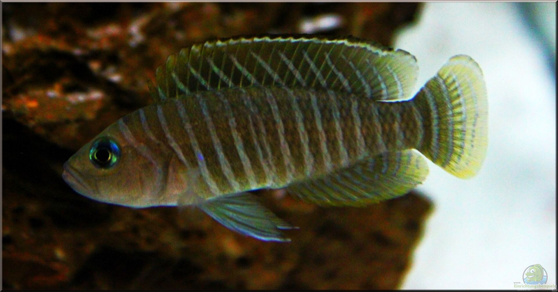 Dieser kleine quirlige Geselle besitzt ein schöne Zeichnung aus hellen schmalen Streifen welche scharf abgegrenzt sind zu breiten dunklen Streifen, auch bei diesem Buntbarsch sind die Männchen kräftiger gefärbt wie die Weibchen.