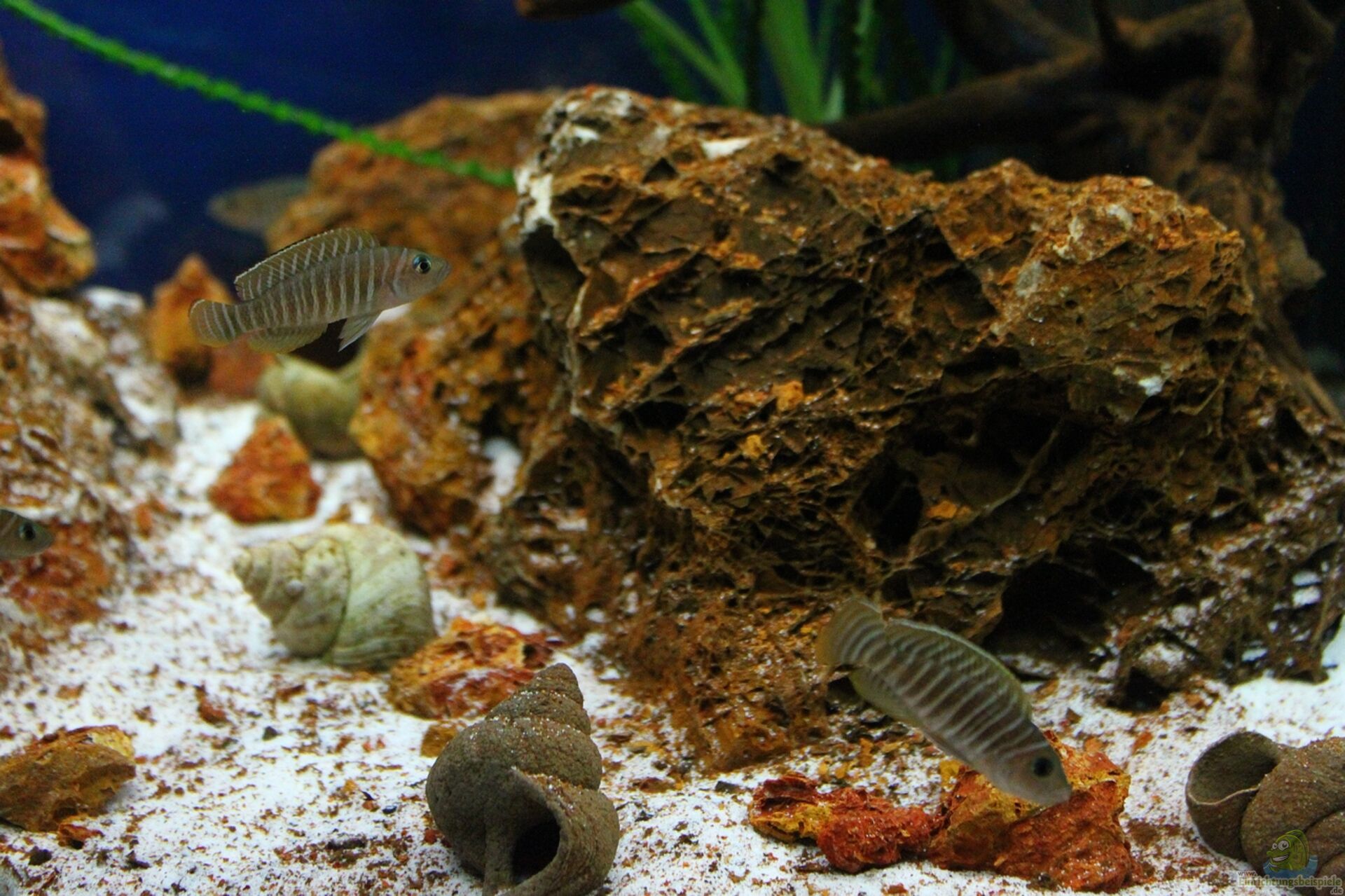 braucht es nicht viel um diesen Tieren ein artgerechtes Heim zu bieten, neben feinem Sand sind hier einige Schneckenhäuser und auch Steine unterschiedlichster Form und Farbe zu nennen, auch Pflanzen dürfen gerne eingebracht werden und bleiben unbehelligt, selbst ein ausgraben wie z.b. beim Neolamprologus multifasciatus findet kaum statt.