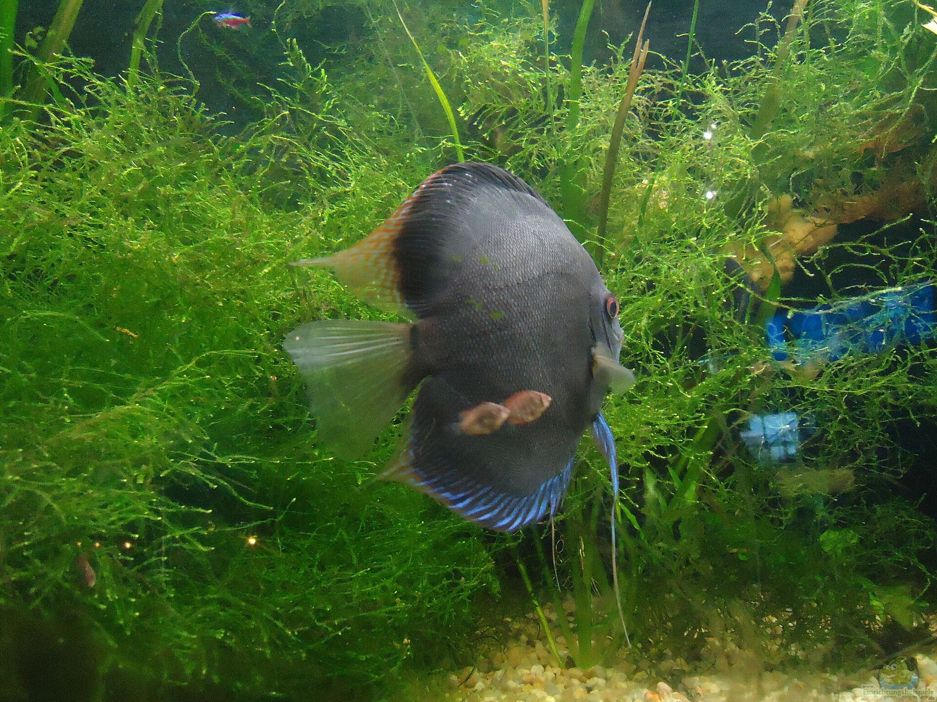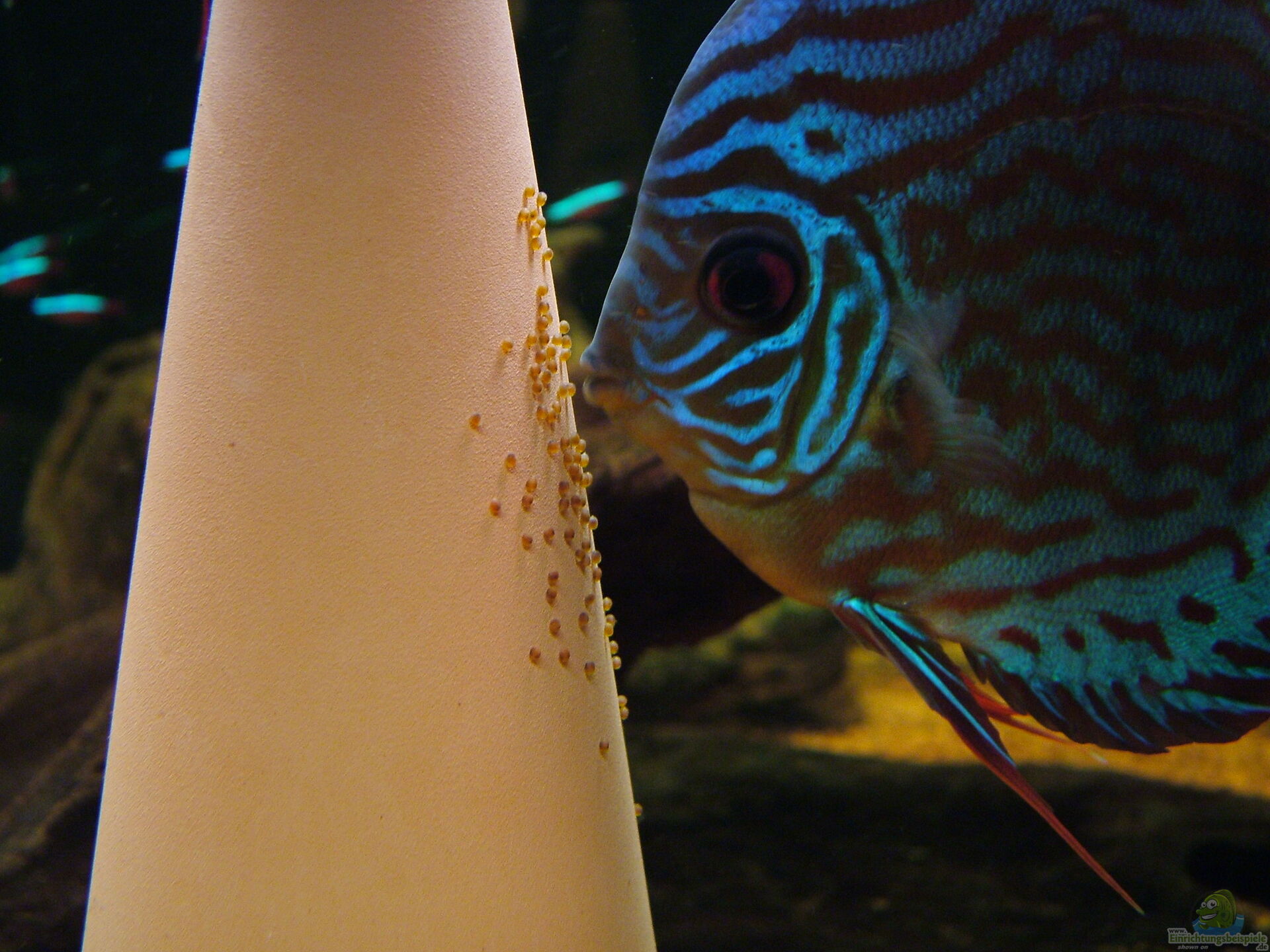 Nach der Eiablage beginnt die Phase der intensiven Brutpflege. Beide Eltern kümmern sich gleichermaßen um das Gelege. Sie fächeln mit den Flossen frisches Wasser über die Eier, entfernen abgestorbene Eier und verteidigen ihr Revier sehr energisch gegen Eindringlinge. Selbst sonst ruhige Diskus können in dieser Zeit ausgesprochen territorial werden.