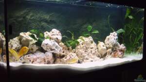 Das Abdunkeln der Leuchtstoffröhren an den Enden scheint sich zu bewähren. Die Yellows kommen nun vermehrt ins freie Wasser, trotzdem habe ich das Gefühl dass es immer noch zu hell ist. Zwischendurch wirft sich ein Yellow auf den Sand, und scheuert sich daran. Dies wird aber nur sehr vereinzelt gemacht, so denke ich dass dies ein natürliches Verhalten ist, was man auch dahingehend beurteilen könnte, dass es dem Fisch oder den Fischen gefällt.