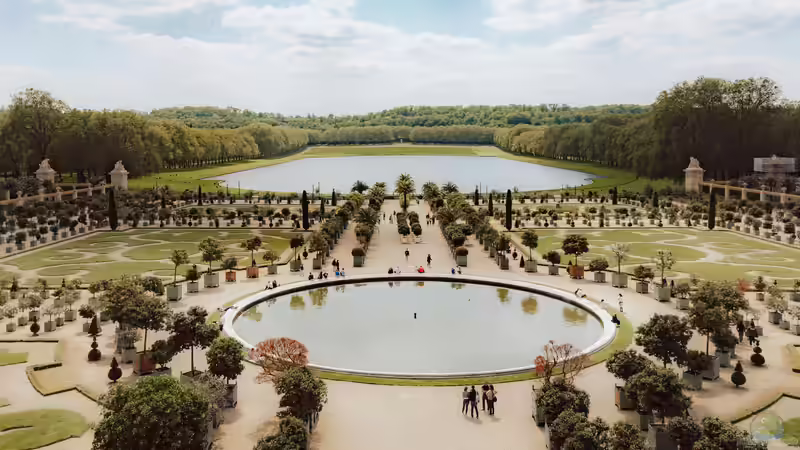 Das Besondere an den Gärten von Versailles ist ihre streng geometrische Ordnung. Aus der Vogelperspektive wird ersichtlich, wie jeder Weg, jede Hecke und jedes Blumenbeet auf Achsen und Symmetrien ausgerichtet ist. Der zentrale Punkt ist das Schloss selbst, von dem aus sich die Gärten nach Westen hin entfalten.