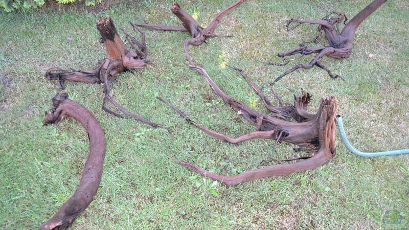 Fotos 8 & 9: Einige Moorkienwurzeln nach dem Reinigen. Sie wurden nur mit einem Schlauch abgespüllt um die alte Patina nich zu entfernen. Einige Wurzeln in einem der beiden IBC-Tanks.