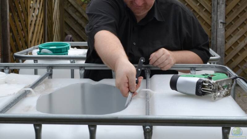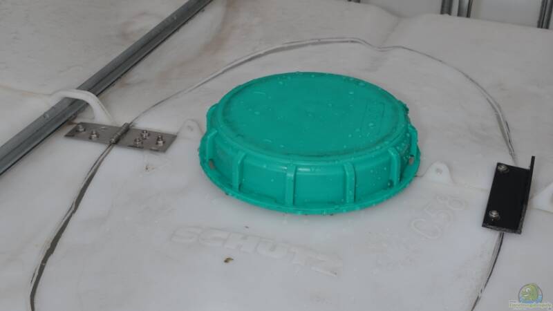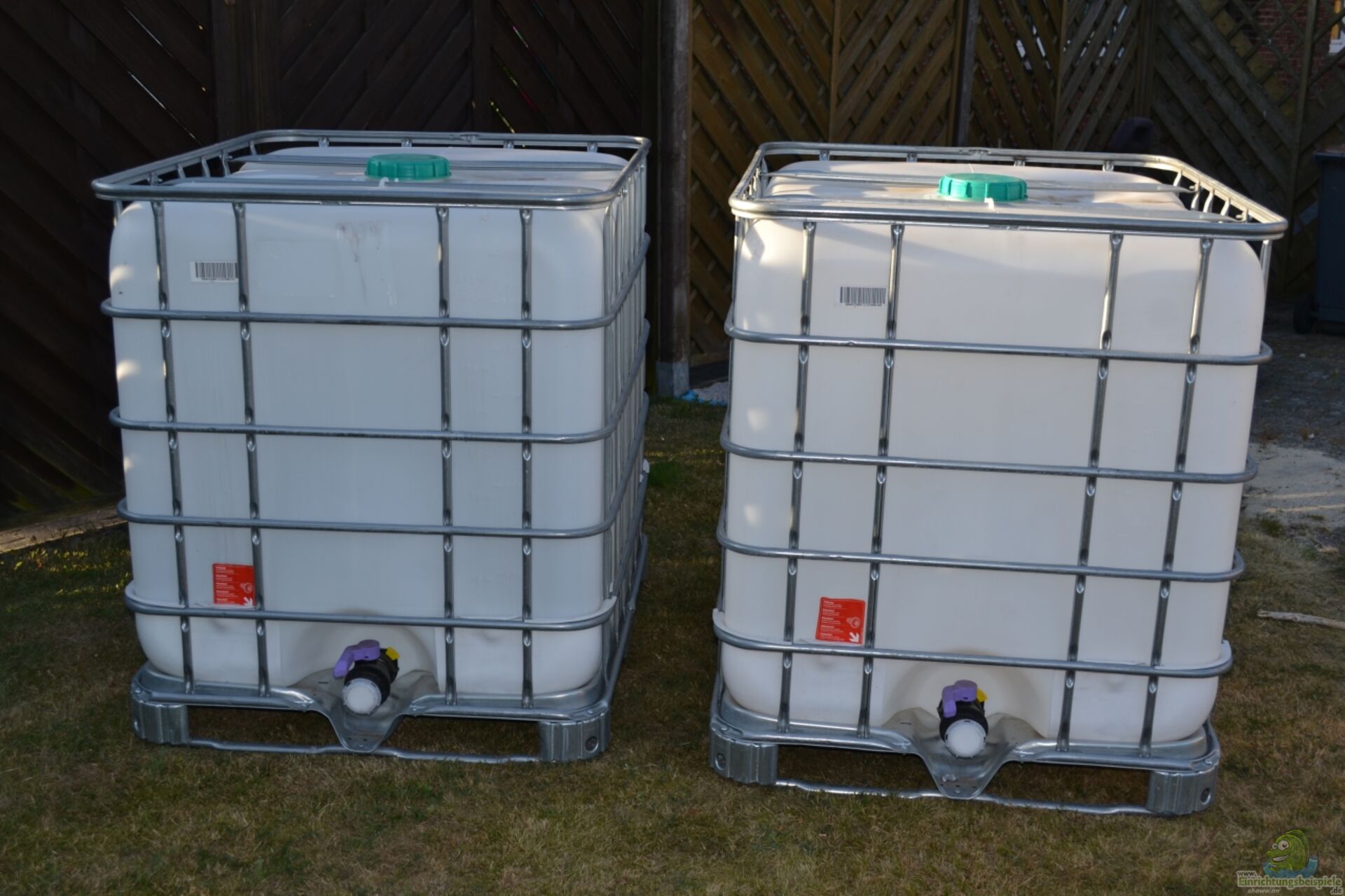 Diese wurde in Form 2er je 1000l gro??er IBC-Tanks für den Lebensmitteltransport gefunden. Die Tanks selber wurden über eBay besorgt, man bekommt Sie dort recht günstig. Aber selbst so sind sie nicht für die Hälterung der Fische geeignet, da man einen Arowana von ca. 50cm nicht einfach durch ein enges Spundloch von einigen Zentimetern bekommt.