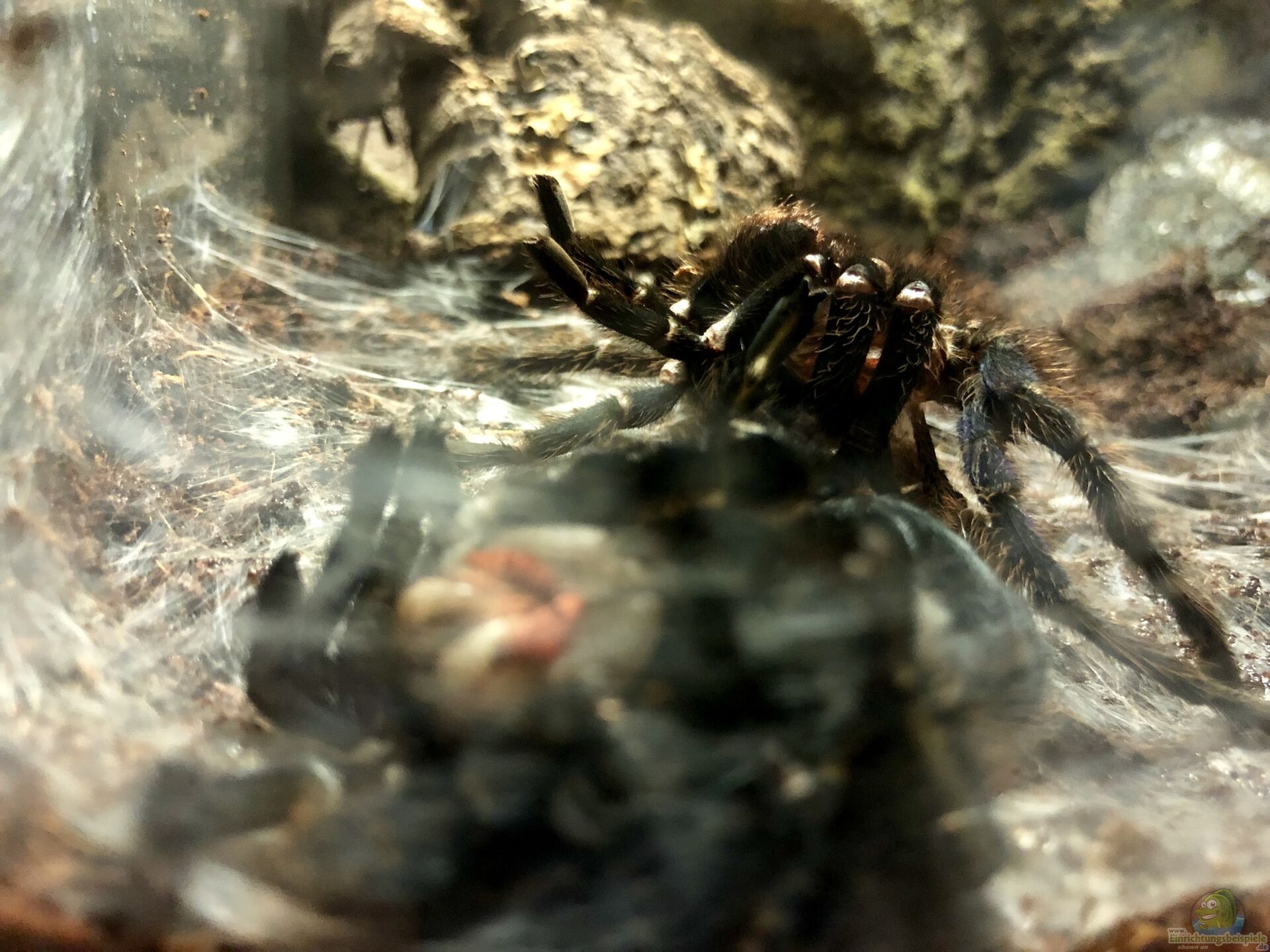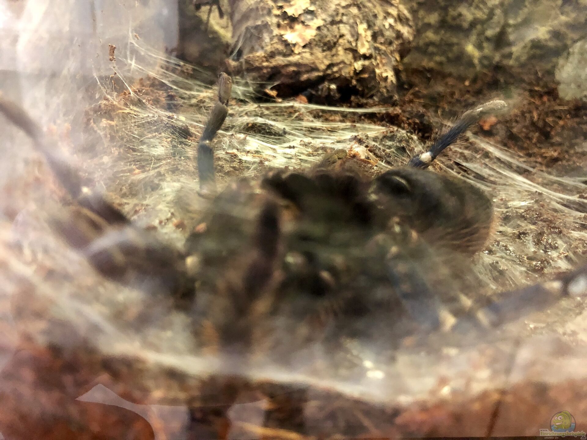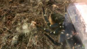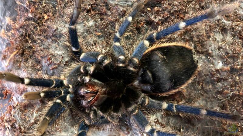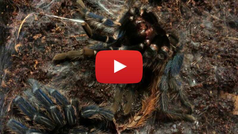 Auf den Bildern und im Video sieht man meine Chromatopelma cyaneopubescens. Es ist ein Weibchen, das sich seiner Haut entledigt. Hierzu hat sich das Tier einen Platz gesucht und diesen mit Spinnfäden ausgestattet. Anschlie??end hat sich die Vogelspinne auf den Rücken ???geworfen???, um so aus der Haut schlüpfen zu können. Hierzu ist die Spinne vermutlich an der Glaswand des Terrariums ein kleinwenig schräg hinaufgeklettert und hat sich dann auf den Rücken gedreht.