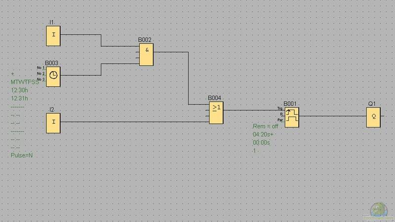 Sobald das passiert schaltet B002 durch - denn B004 ist ein ODER-Glied bei dem es reicht wenn an einem Eingang eine 1 ansteht um durchzuschalten. Von dort wird nun B001 aktiviert, ein flankengetriggertes Wischrelais. Dies ist so eingestellt das es für genau 4, 2 Sekunden durchschaltet. Das ist die Zeit, die die Pumpe laufen muß - und die Zeit muß man einfach selber an die gewünschten Düngemenge anpassen. Der Ausgang von B001 geht auf Q1, Q1 ist ja nichts anderes als ein Relais an dem unsere Pumpe hängt...