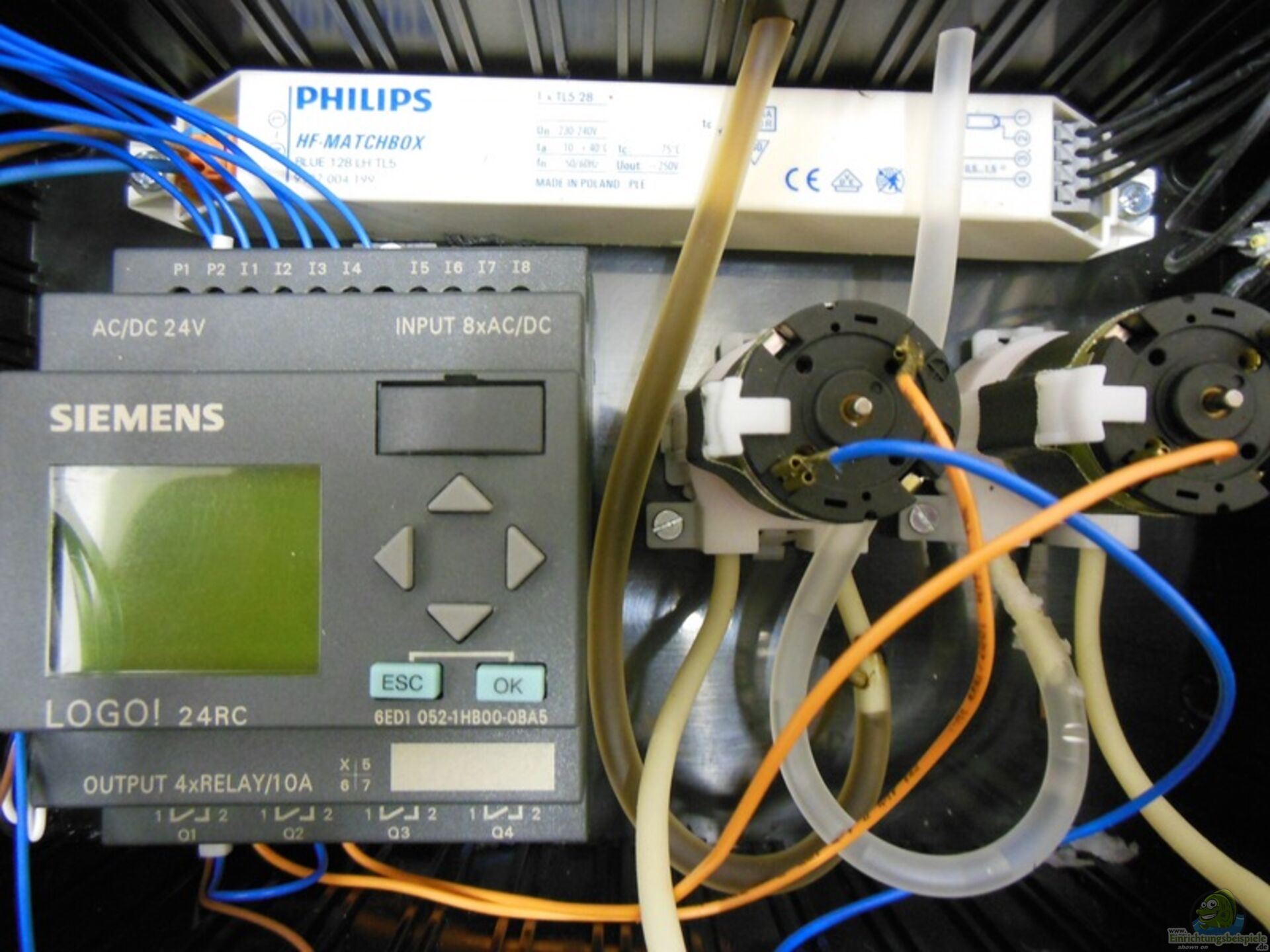 Dann sieht man die beiden Vorratstanks in denen sich der Flüssigdünger befindet. Die Schläuche führen aus den Tanks hin zu den Pumpen die im Inneren sitzen, oben sieht man die Schläuche wieder aus dem Gehäuse kommen. Von dort gehts dann direkt ins Becken...