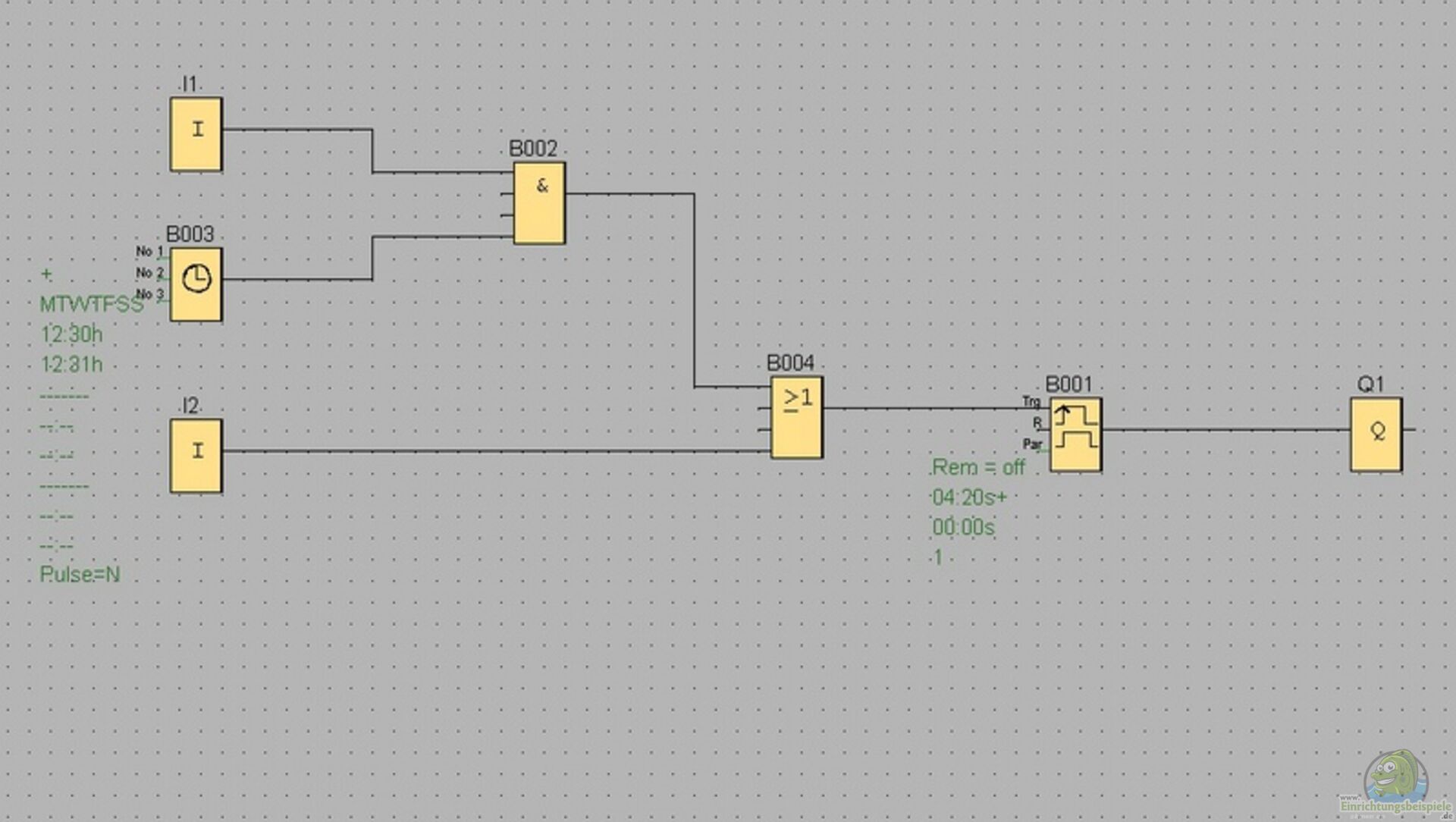 An I1 liegt Spannung an sobald ich den Schalter auf Automatik stehen habe, das heißt an UND-Verknüpfung B002 steht eine 1 an. Hier gehts jedoch nicht weiter, denn alle mit B002 verknüpften Bedingungen müssen eine 1 haben. Fehlt also noch das Signal von B003, das ist eine Wochenzeitschaltuhr. Diese ist so parametriert das sie täglich zwischen 12:30 und 12:31 eine 1 bringt.