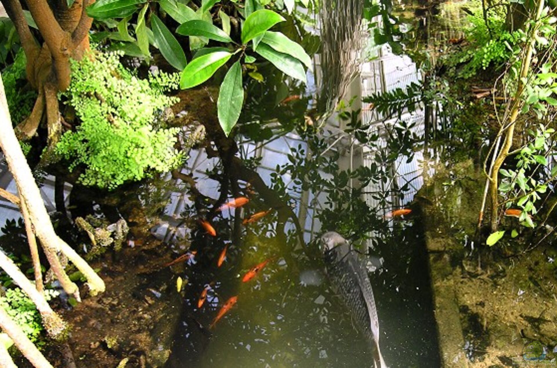 Ein solches Setup kann als Paludarium (Kombination aus Aquarium und Terrarium) oder als vollständig geflutetes Aquarium umgesetzt werden.