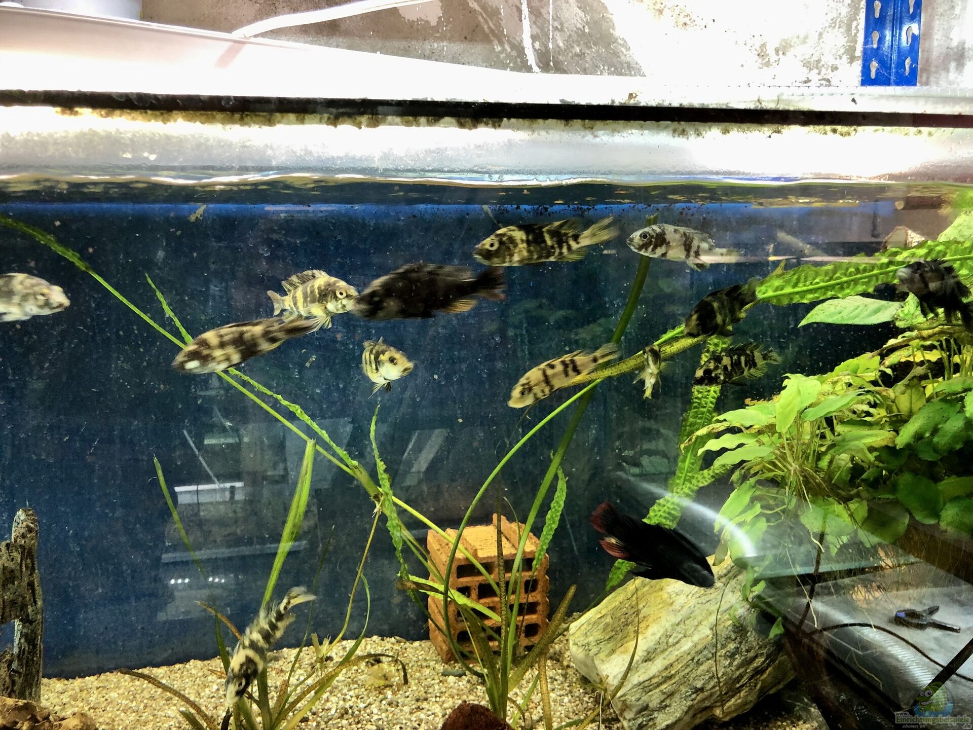 Im Becken schwammen mehrere Tropheus duboisi MASWA und ein ???Pärchen??? Tropheus spec. RED RAINBOW KASANGA. Au??erdem waren einige Anubien auf Steinen vorhanden. Dass ich eine Terrarien-Röhre eingesetzt hatte, verga?? ich alsbald und freute mich jedoch, als das Becken immer besser zu laufen begann. Die Tropheus duboisi MASWA bekamen sehr viele Jungtiere und sogar die beiden RED RAINBOW schritten zur Eiablage. Aus Tropheus-Fankreisen wei?? ich, dass das eigentlich nicht vorkommt, dass zwei übrig gebliebene Tiere in einer anderen Tropheus-Gruppe zur Brut schreiten und sogar ein Jungtier aufkommt. Normalerweise werden andere Arten oft unterdrückt und Tropheus-Arten sollte man in einem Artbecken halten. Das Tier nannte meine Mutter Jack und Jack schwimmt noch heute in meinem Becken bei den MASWA umher. (Das Tropheusbecken ist übrigens knapp 20 Jahre alt. Die jetzigen Tropheus bzw. deren Vorfahren kamen 2009 zu mir.)