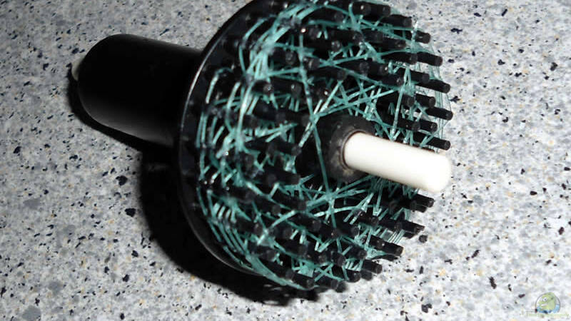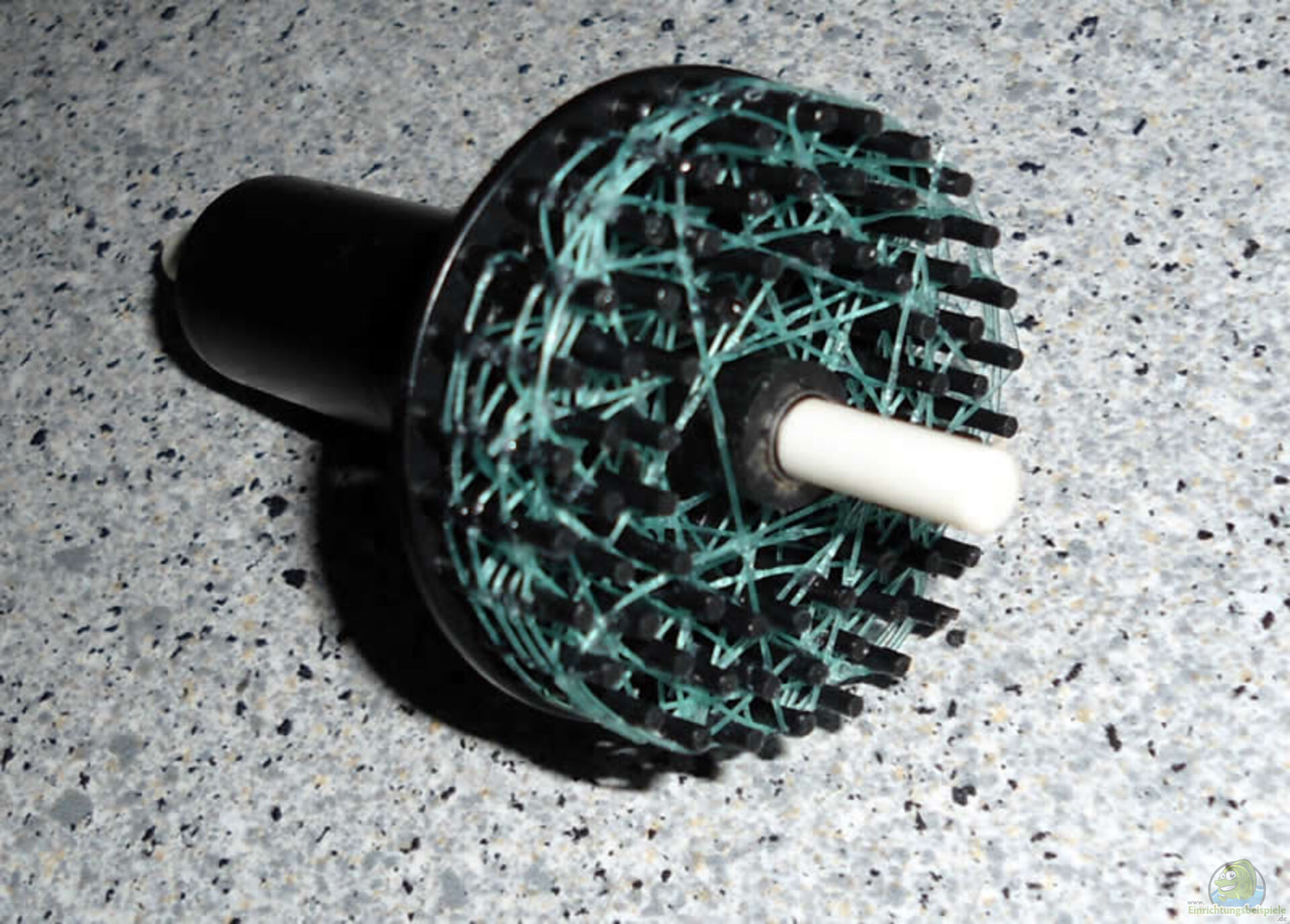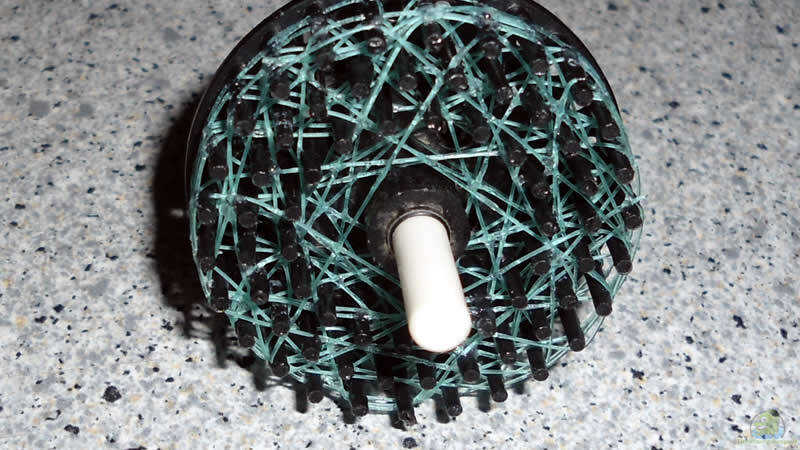 Eine weitere sehr populäre Methode die Leistung des Abschäumers zu verbessern ist, wenn man aus dem Nadelrad ein Fadenrad macht. Mittlerweile sind schon die meisten Hersteller auf den Zug aufgesprungen und versuchen verzweifelt ein Nadelfadenrad zu entwickeln. Um dieses "Tuning" zu machen benötigt man eine Angelschnur oder eine Böschungsmatte aus Kunststoff (je nach dem aus welchem Kunststoff das Nadelread ist, denn nicht überall kann man kleben) und man befestigt diese sorgfältig über die gesamte Höhe der Nadeln. Dabei sollte die Schnur möglichst chaotisch um die Nadeln gewickelt werden. Als Enderfolg beim 9420 verringert sich zwar die Luftleistung leicht von 850 Liter auf ca. 800 Liter, allerdings ist der Schaum viel feiner und steigt zäher im Skimmer. durch die entsprechend grö??ere Oberfläche der Blasen kann man ca. davon ausgehen, dass die Leistung nochmals um 25% oder mehr gesteigert wird. Dieses Tuning ist für alle Nadelräder anwendbar.