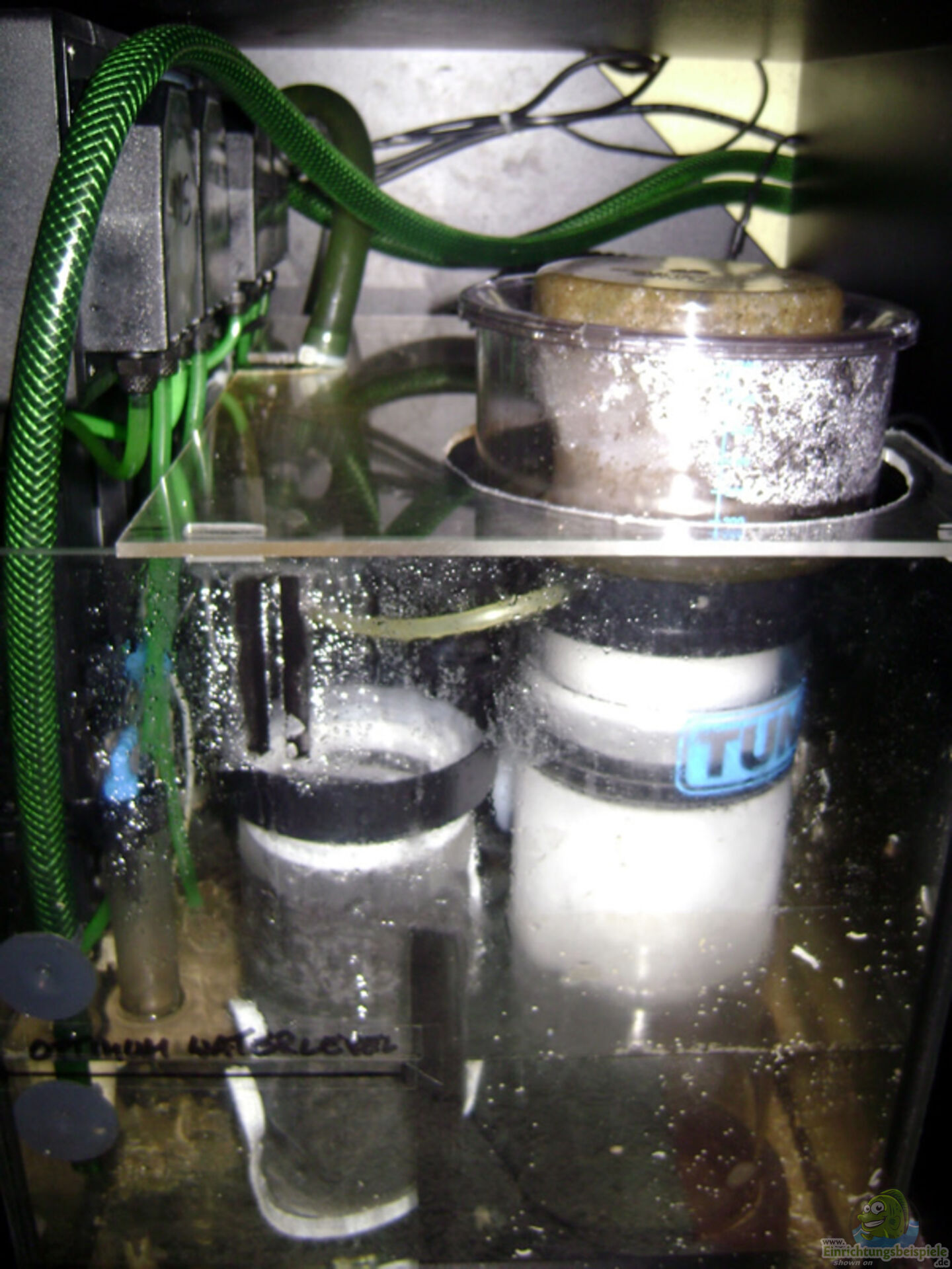 Wenn man den Skimmer ein wenig kennt und das Becken obiges Tuning ohne Luftdrosselung weg steckt, dann gibt es noch die Möglichkeit den stärkeren Hydrofoamer 9420.002 an zu schlie??en. Die Pumpen 9410.002 und 9420.002 sind an sich baugleich, nur die Spule und der Antrieb sind bei der grö??eren Pumpe stärker bzw. grö??er. Dazu muss allerdings die Drossel wieder eingebaut werden, dadurch wird es möglich die Abschäumung fein ein zu stellen. Alte Pumpe ab geschraubt, neue eingeschraubt - Achtung: Lufteinzug drosseln und den Wasserauslauf um ca. 3cm kürzen. Dazu wird es auch noch nötig den Wasserstand im Technikbecken auf 17cm zu senken um den mehr an Wasserdurchsatz in dem kleinen Rohr gerecht zu werden. Damit erreicht man eine Steigerund des Wasserdurchlaufs um ca. 50% eine Steigerung der Luftzufuhr um ca. 10% und da es notwendig wird die Luft zu drosseln, kommen jene die mit obigen Tuning noch immer keine starken Gegenstrom erzeugen konnten in den Genuss die gesamte Reaktorkapazität zu nutzen. Durch diesen Umbau erhält man eine insgesamt doppelt so starke Abschäumung und hat die Möglichkeit die Leistung bei bedarf nochmals zu erhöhen. Dadurch wird dieser Skimmer in seiner kompakten Bauweise und geringen höhe der Leistungsstärkste in seiner Baureihe, absolut unschlagbar.