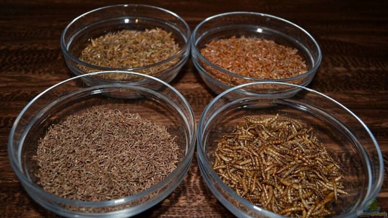 Bild 5: Loses FD-Futter, unten links rote Mückenlarven, unten rechts Mehlwürmer, oben links Sü??wasser-Shrimps 1-2cm und oben rechts Bachflohkrebse (Grammarus), auch hier sind noch weitere Sorten erhältlich.