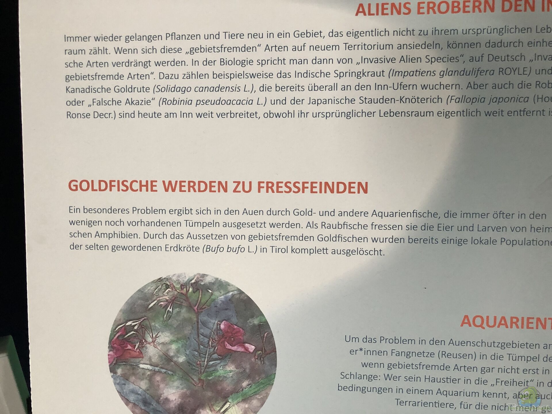 Wenn man im Fröschl-Haus weitergeht, kommt man zu einem gro??en Freiland-Aquarium, dessen Glasscheibe am tiefsten Punkt Indoor für die Besucher mit eigenen Sitzplätzen zum längeren Verweilen einlädt. Dort wird momentan auch auf die fremden Arten hingewiesen, die mittlerweile in unserem einheimischen Fluss Inn, der durch ganz Tirol flie??t und anderen Gewässern leider zu finden sind. Unser Inn ist eine Initiative vom WWF und wird von weiteren Firmen unterstützt.
