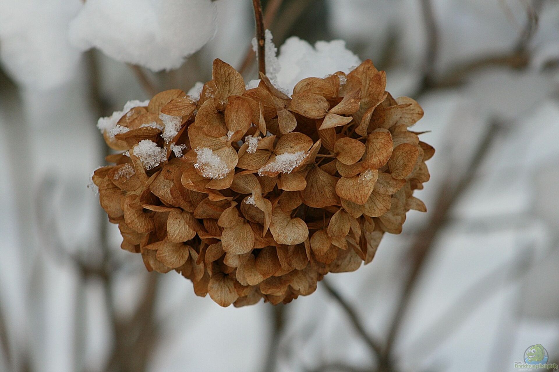 Schneeballhortensien wie die bekannte Sorte ‘Annabelle’ sind robuster als Bauernhortensien. Sie bilden ihre Blüten an den neuen Trieben und reagieren nicht empfindlich auf Frost. Ein Rückschnitt erfolgt jedoch nicht im Herbst, sondern erst im späten Winter oder frühen Frühjahr. Im Herbst ist keine besondere Pflege notwendig, außer trockene Blätter und schwaches Holz zu entfernen.