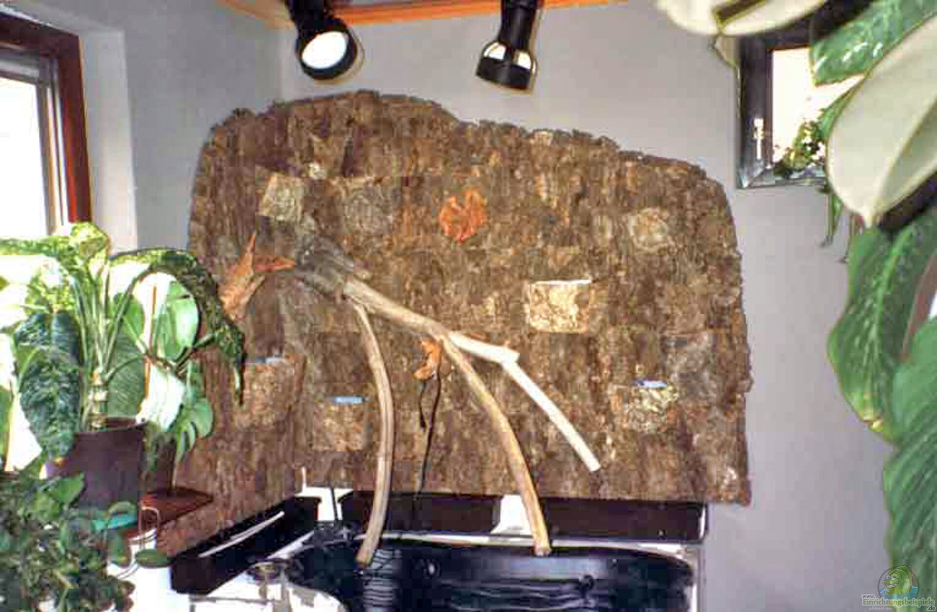 Eine Eheim 2252 - also ein kleines Kraftpaket - wurde später zusätzlich eingebaut, um auch Schwebstoffe, Kot, Futterreste etc. herauszufiltern. Mit der Bepflanzung gut getarnt, wurde der Filter unsichtbar gemacht. Ein Gro??er Ast wurde so montiert dass auch Wasser über den Stamm rinnen konnte. Mit einem Aquarien Luftschlauch war die Zuleitung dafür auf der Hinterseite des Stammes versteckt.