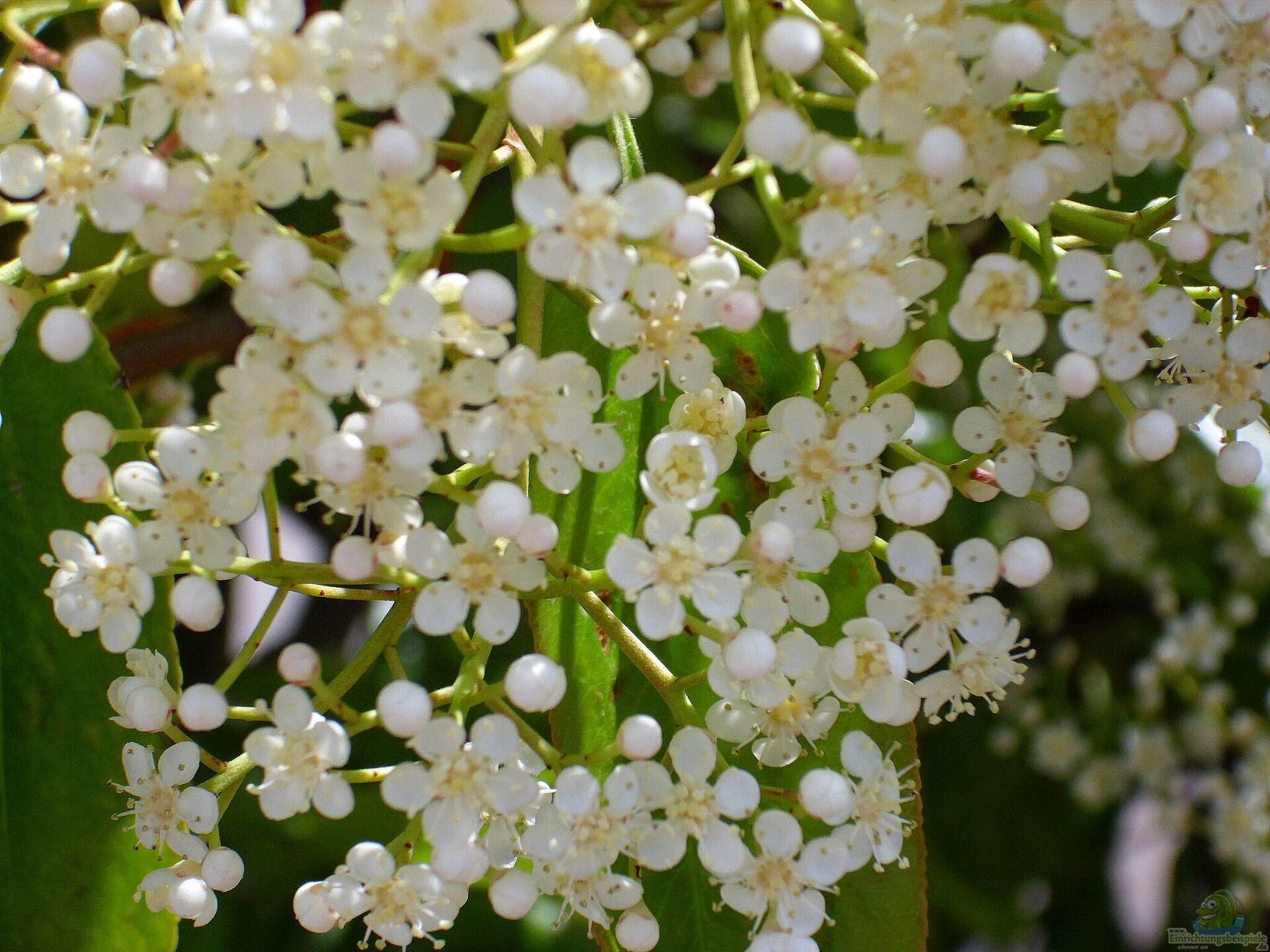 Im späten Frühjahr bilden sich kleine, weiße Blüten in dichten Dolden. Diese sind zwar optisch dezent, ziehen aber zahlreiche Insekten an und leisten damit einen wichtigen Beitrag zur Biodiversität im Garten. Aus den Blüten entwickeln sich später kleine, runde Früchte, die sich im Herbst dunkelrot bis schwarz färben und als Nahrungsquelle für Vögel dienen.