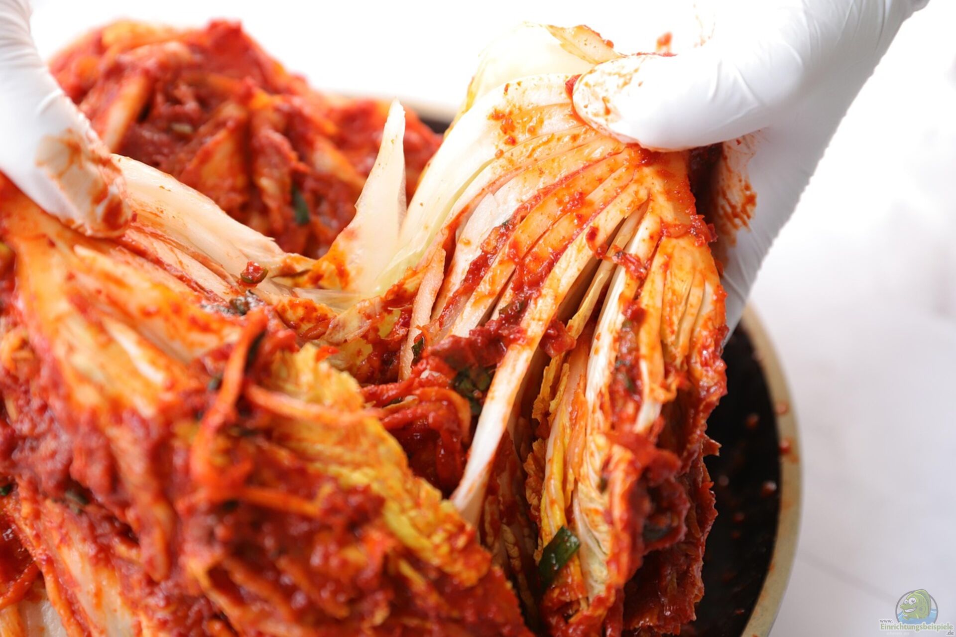 Wenn der Kohl nicht richtig gesalzen ist, wird das Kimchi später matschig oder fault. Ist er zu stark gesalzen, hemmt das die Fermentation. Dieser Schritt entscheidet über Erfolg oder Misserfolg.