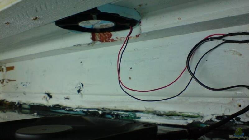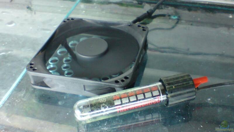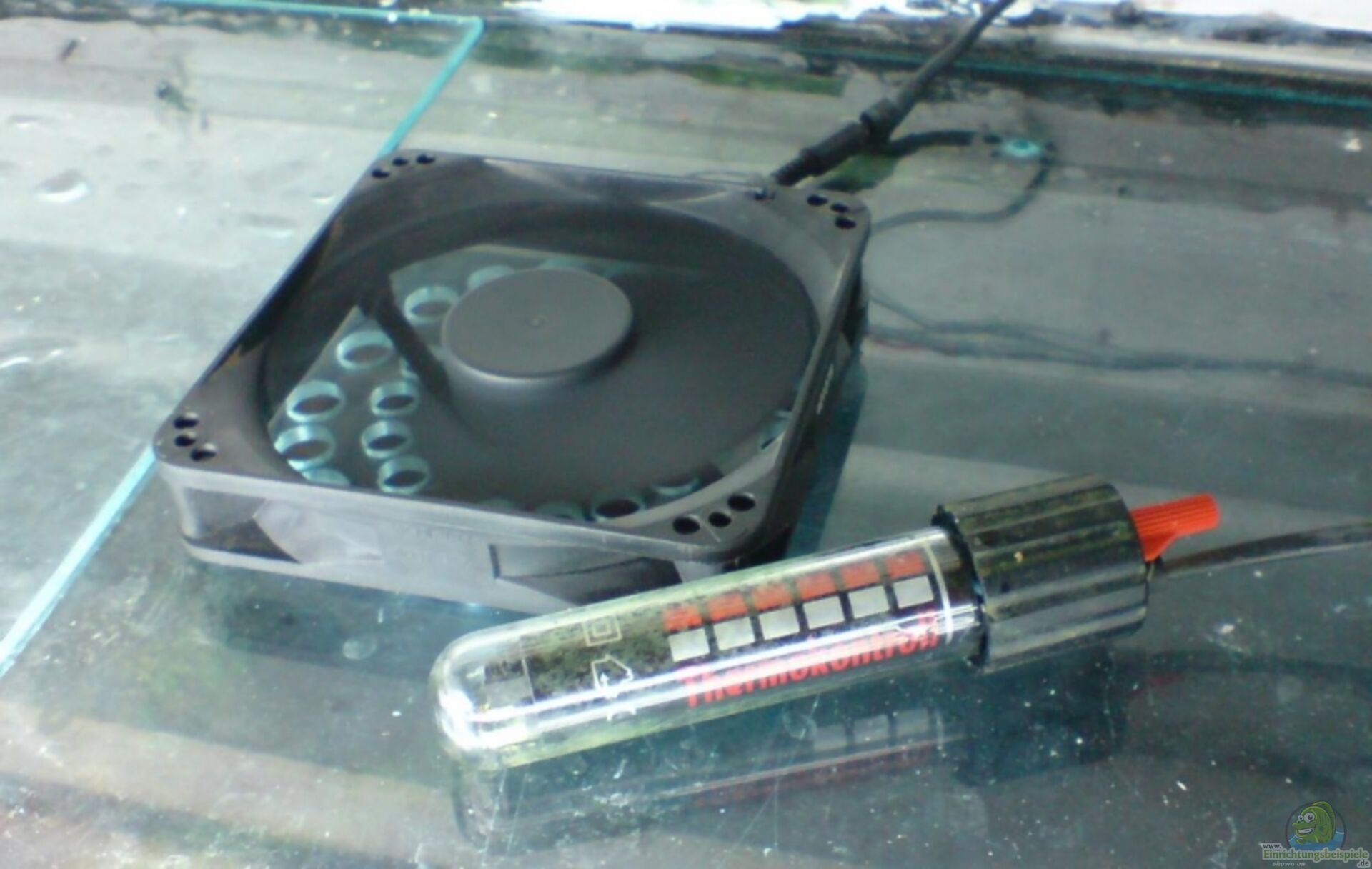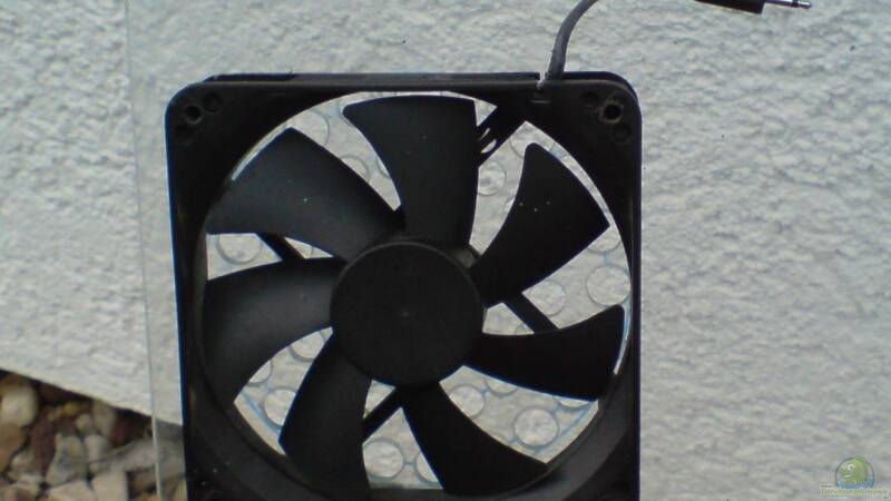 Bisher habe ich mein Malawibecken nur mit einem WC-Lüfter (230V), der in der Abdeckung eingebaut war, gekühlt. Das funktionierte soweit auch sehr gut, aber leider mu??te ich den Ventilator manuell einschalten und die Abdeckscheibe vom Becken nehmen, was mich sehr genervt hat.