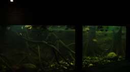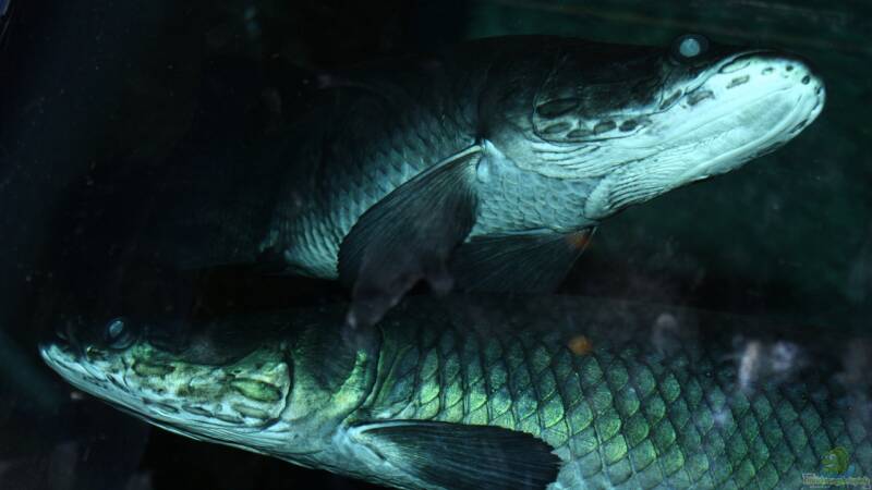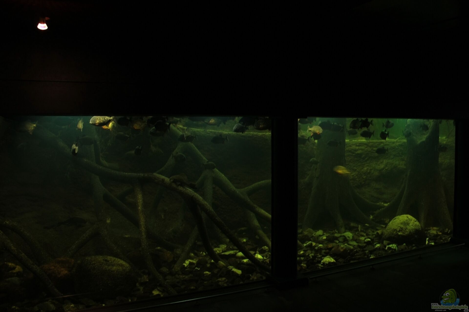 Zunächst kommt man in einen grösseren Raum in dem 3 Becken untergebracht sind. Zum einen ist hier ein gigantisches Tanganjikabecken(B) untergebracht in welchem man bekannte Arten wie Xenotilapia, Julidochromis(B) oder Cyprichromis findet, doch dominiert und beherrscht wird das Becken von dem Tanganjika Perlmutterfisch (B), einer grossen Tilapiaart. Daneben ist ein Biotopbecken mit Knochenhechten(B) zu finden und ein grosses Südamerikabecken (B), welches 2 halbstarke Arapaimas(B) beheimatet.
