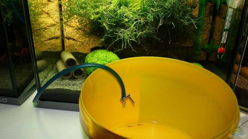 Hier lässt man das Beckenwasser über einen dünnen 4/6er-Schlauch in den Eingewöhnungsbehälter tropfen, bis sich mindestens die vier- bis fünffache Menge des mitgebrachten Wassers im Eingewöhnungsbehälter befindet.