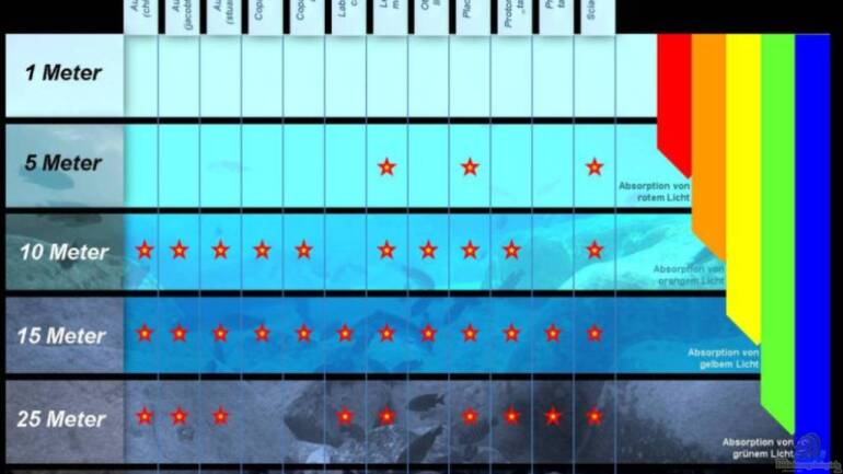Aussagen, dass die Sonne über dem Malawisee besonders stark sei und auch in tiefere Wasserregionen vordringen würde, sind nur bedingt richtig. Korrekt ist, dass die Sonnenstrahlen in Aequator-Nähe in einem steileren Winkel auf die Erde resp. das Wasser auftreffen und das Licht somit beim Auftritt weniger stark gebrochen wird als bei uns in Zentral-Europa ??? trotzdem werden aber die verschiedenen Lichtwellen unter Wasser Schritt für Schritt absorbiert. Die in der Grafik definierten Eindringtiefen basieren auf den Werten im Malawisee und weichen dadurch ein wenig von europäischen Angaben ab.