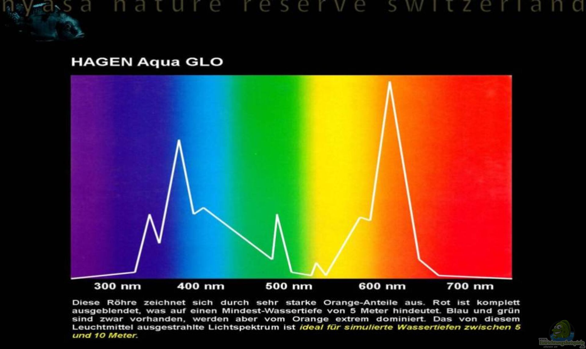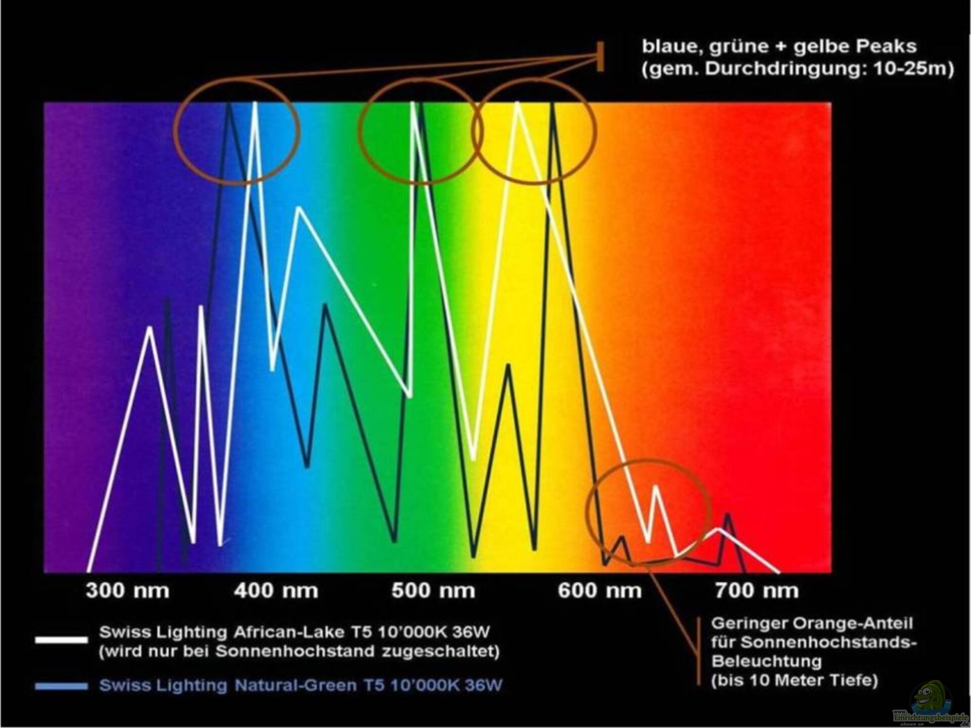 Für die Haltung von Lethrinops marginatus, Placidochromis electra und Sciaenochromis fryeri, welche alle drei in Tiefen zwischen 5 und 25 Metern beobachtet wurden, wäre also ein Mittelwert empfehlenswert. Das würde bedeuten, ein Leuchtmittel ohne Rot-, sehr geringen Orange- und dominanten Gelb-, Grün- und Blau-Anteilen wäre hier die richtige Wahl.