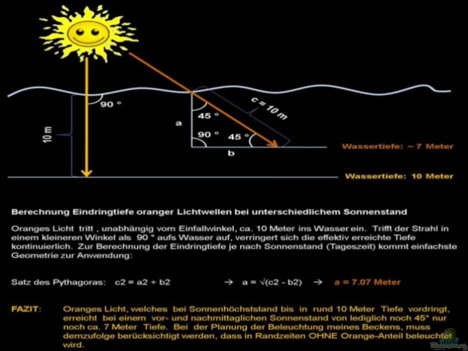 Je nach Einfallwinkel und somit je nach aktuellem Sonnenstand ändert sich die effektive Wassertiefe bis zur Absorbation der verschiedenen Lichtwellen. Die neue Grafik (unten) zeigt auf, wie sich das Verhalten z.Bsp. oranger Lichtwellen im Wasser verändert, wenn die Sonne in einem flacheren Winkel steht. Die gezeigte Grobberechnung kann helfen, das Beleuchtungszenario während Randzeiten zu definieren.