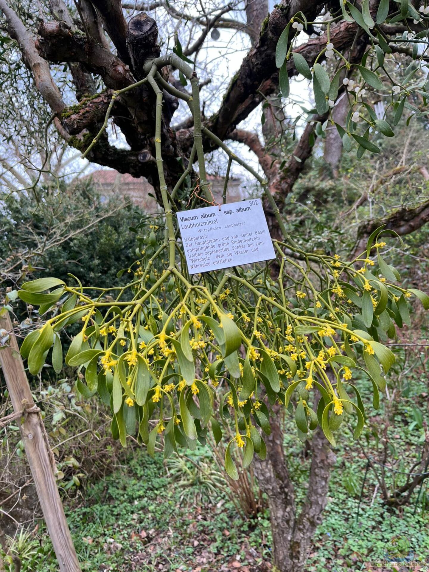 Nach der Keimung auf einem Ast dringt dieses Haustorium durch die Rinde bis in das Holz des Wirtsbaumes ein. Dort verzweigt es sich im Inneren des Astes und verbindet sich mit den wasserleitenden Gefäßen. Der sichtbare Mistelbusch ist daher nur ein Teil der Pflanze. Ein erheblicher Anteil befindet sich verborgen im Holz des Baumes.