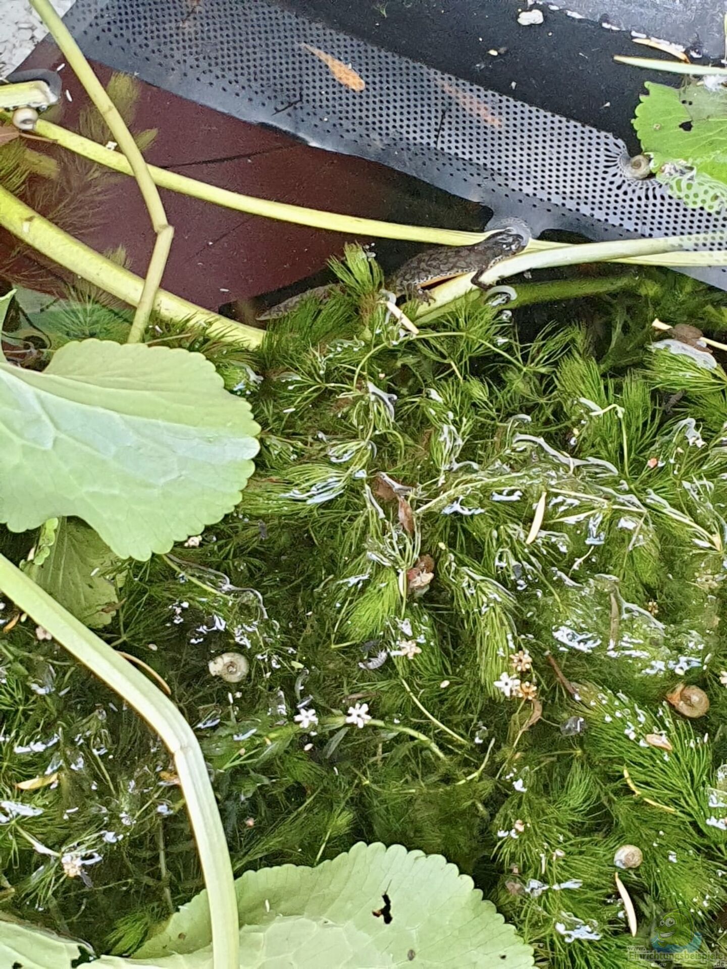 Der Molch machte auch keine Anstalten, aus dem neuen Habitat zu verschwinden. Mittlerweile ist das Tier schon über zwei Monate im Biotop anzutreffen und scheint auch gar nicht scheu zu sein. Er taucht auf, sobald meine Aquarien-Kollegin am Teich ist und zu hören ist. Sie hat es mir demonstriert und ich war sehr überrascht.