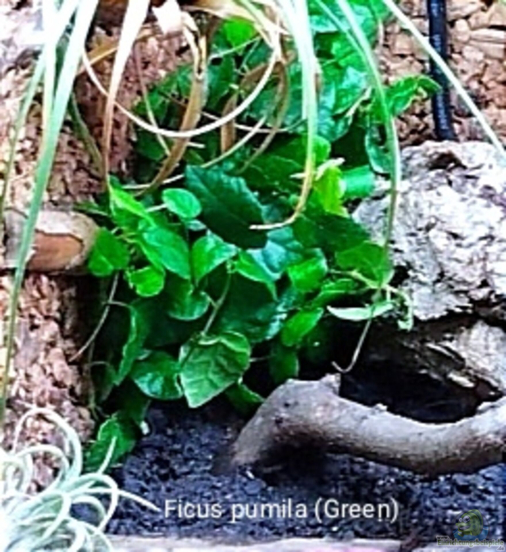 In kleineren Terrarien einen schönen grünen Hintergrund hinzubekommen ist oft problematisch. Viele Pflanzen die zur Auswahl stehen, wuchern in Windeseile die ganze Landschaft zu und erdrücken somit die anderen pflanzlichen Bewohner. Daher sind als Begrünung der Rückwand und der Seitenwand kleinere Pflanzenarten gefragt. Als sehr geeignet haben sich dabei folgende Pflanzen hervorgetan. Zum einen die bekannte Kletter-Feige (Ficus pumila) aus Ostasien, der etwas weniger bekannte langsamer wachsende Eichenblatt-Ficus oder auch die Zwerg-Kletterfeige genannt (Ficus scandens) aus Myanmar und Pesopteris crassifolia, ein kleiner kletternder Farn der sehr schöne Wedel ausbildet und die Rückwand und Seitenwand des Terrariums erklimmt. Pesopteris crassifolia kann sowohl aufgebunden als auch im Topf kultiviert werden. Warm und feuchtes Klima sind für diesen Farn ideal. Die beiden zu letzt genannten Pflanzen sind aber leider im Handel seltener zu bekommen. Übrigens, bei Ficus pumila und Ficus scandens darf der Wurzelballen nie austrocknen. Sie verzeihen eher nasse Füße wie Trockenheit. Bei diesen beiden ist immer auf eine regelmäßige Wasserzufuhr zu achten. Ebenso sollte Pesopteris crassifolia immer einen leicht feuchten Wurzelballen haben. Beim Aufbinden dieses Farns sollte sich immer genug Sphagnum im Bereich der Wurzeln befinden, welches als Feuchtigkeitsspeicher dient. Beim Einpflanzen im Topf muss auf ein lockeres Substrat geachtet werden. Als Substrat eignet sich für diesen Farn sehr gut eine Mischung aus grober Lauberde, Torf und groben Rindenstücken.