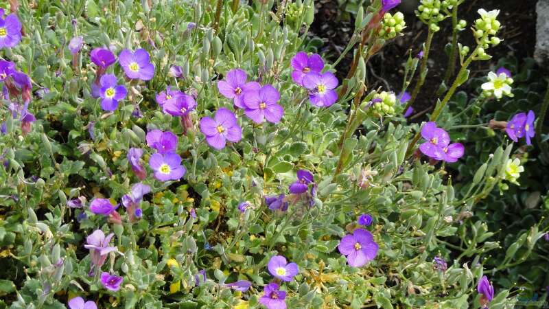 Das Blaukissen ist eine weitere beliebte Pflanze für Steingärten in Deutschland. Diese kriechende Staude bildet dichte Polster aus violetten, rosa oder weißen Blüten, die im Frühjahr für ein farbenfrohes Spektakel sorgen. Aubrieta ist äußerst pflegeleicht und robust, was sie zu einer idealen Wahl für Hobbygärtner macht, die wenig Zeit für aufwendige Gartenpflege haben.