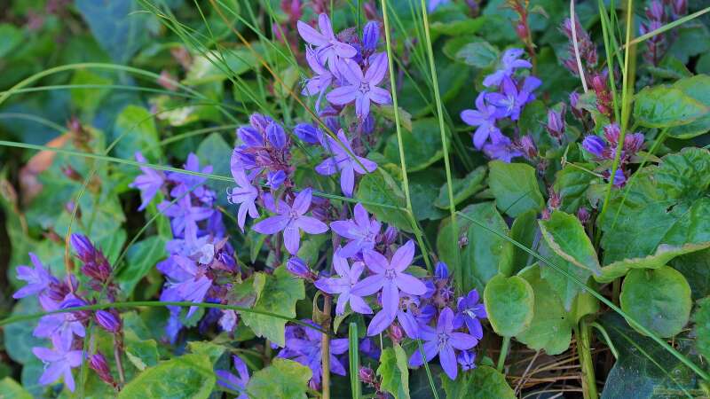 Die Polster-Glockenblume ist eine niedrig wachsende, kriechende Pflanze, die besonders gut in Steingärten gedeiht. Sie bildet dichte Teppiche aus kleinen, glockenförmigen Blüten, die von Mai bis Juli blühen und eine Fülle von Blau- und Lilatönen bieten. Diese Pflanze ist ideal, um Lücken in Steingärten zu füllen und bietet gleichzeitig einen schönen Kontrast zu grünem Laub.