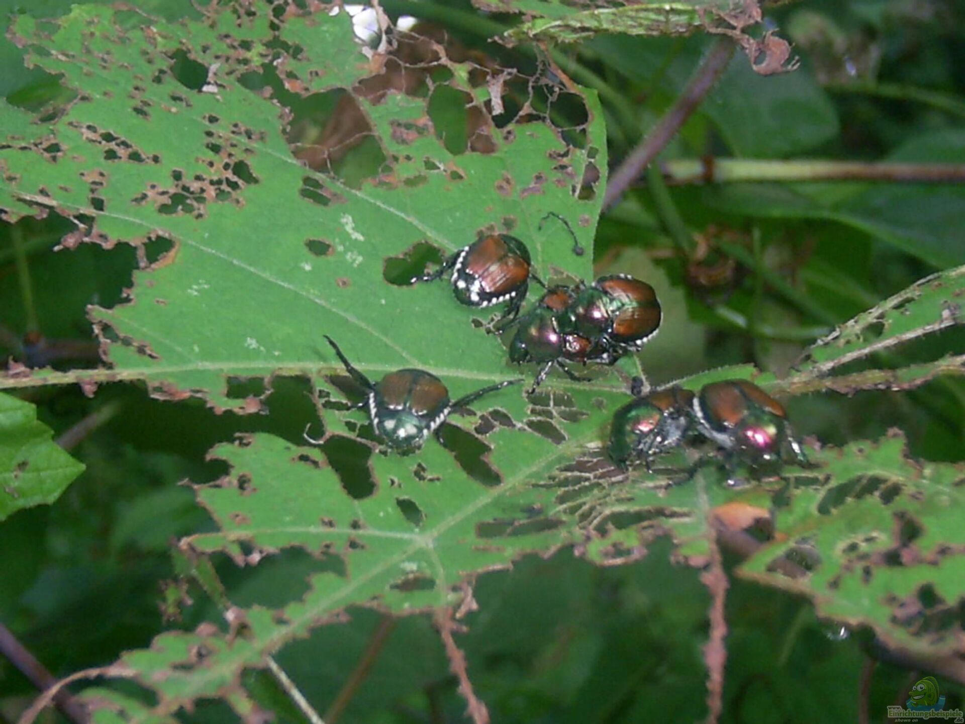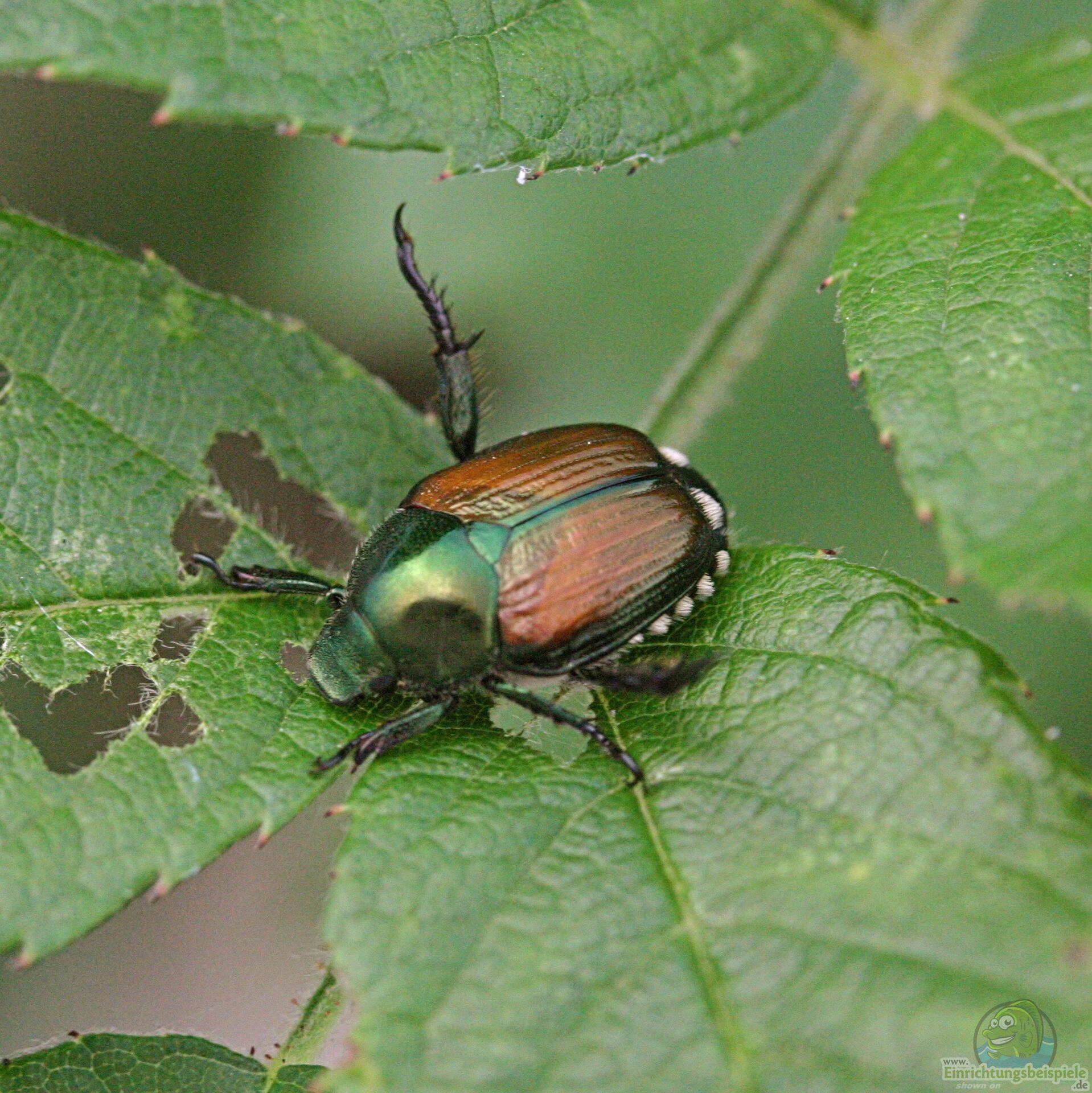 Popillia japonica, im Deutschen meist „Japankäfer“ genannt, ist ein Blattfresser (Familie Scarabaeidae). Die adulten Käfer sind auffällig: metallisch grünlicher Thorax, bräunliche Flügeldecken (Elytren) und kleine weiße Haarbüschel am Hinterleib. Erwachsene fressen an Blättern, Blüten und Früchten; die Larven (Engerlinge) leben im Boden und fressen Graswurzeln. Das macht das Tier für Gärten, Parks, Rasen- und Weideflächen sowie für Obst- und Weinbau gefährlich.