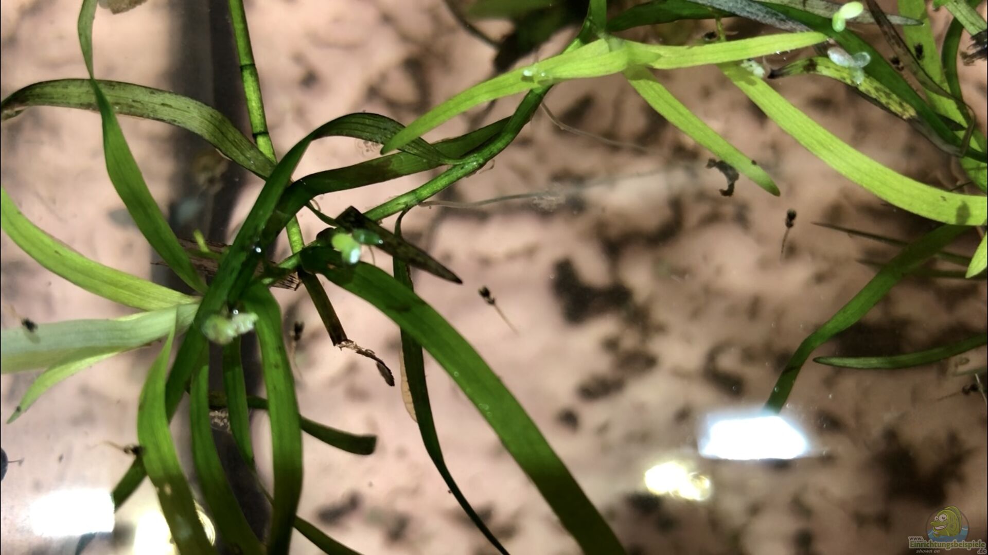 Bald schon stiegen die Temperaturen und wir übersiedelten die acht Tiere in das gro??e Becken mit vielen Algen und Pflanzen. Mein Kollege brachte nochmal veralgte Pflanzen von einem seiner Becken mit, in denen viele Kleinstlebewesen waren und die kamen auch in das Becken. Zusätzlich haben wir zuvor noch Daphnien eingesetzt, die sich auch vermehrten. Au??erdem gaben wir einige Seemandelbaum-Blätter hinzu.